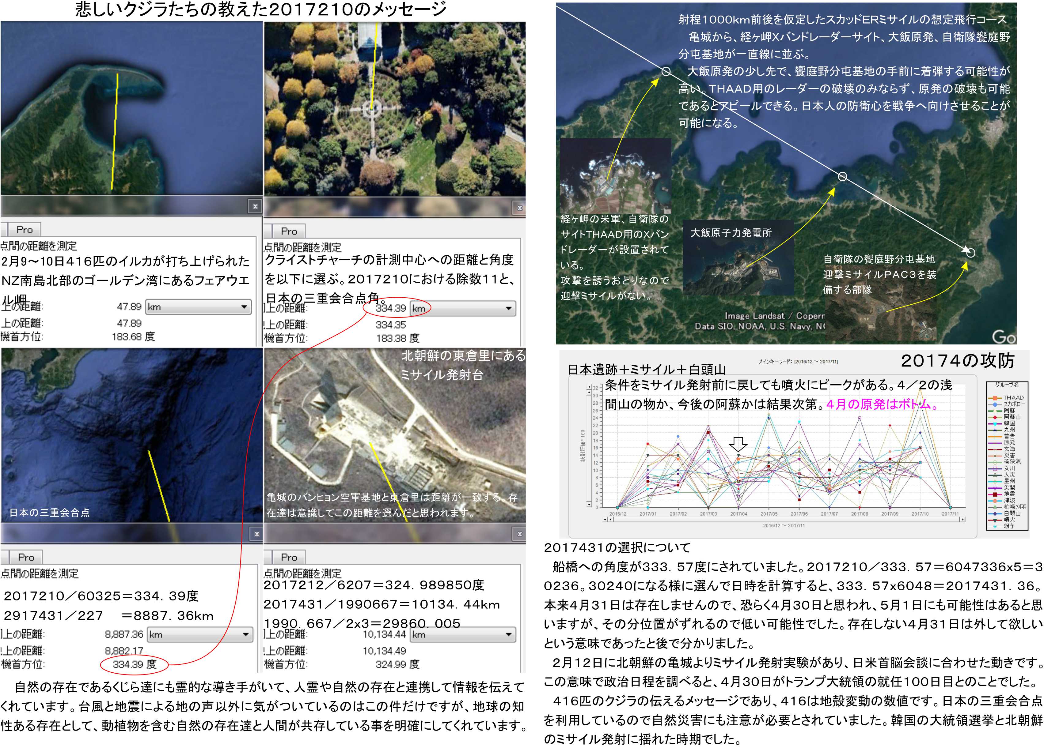 くじら達はその後の北朝鮮のミサイル発射を教えてくれていました。直後の物は回避出来ないのですが、2017431で教えた時期のミサイル発射を回避することを伝えてくれていました。