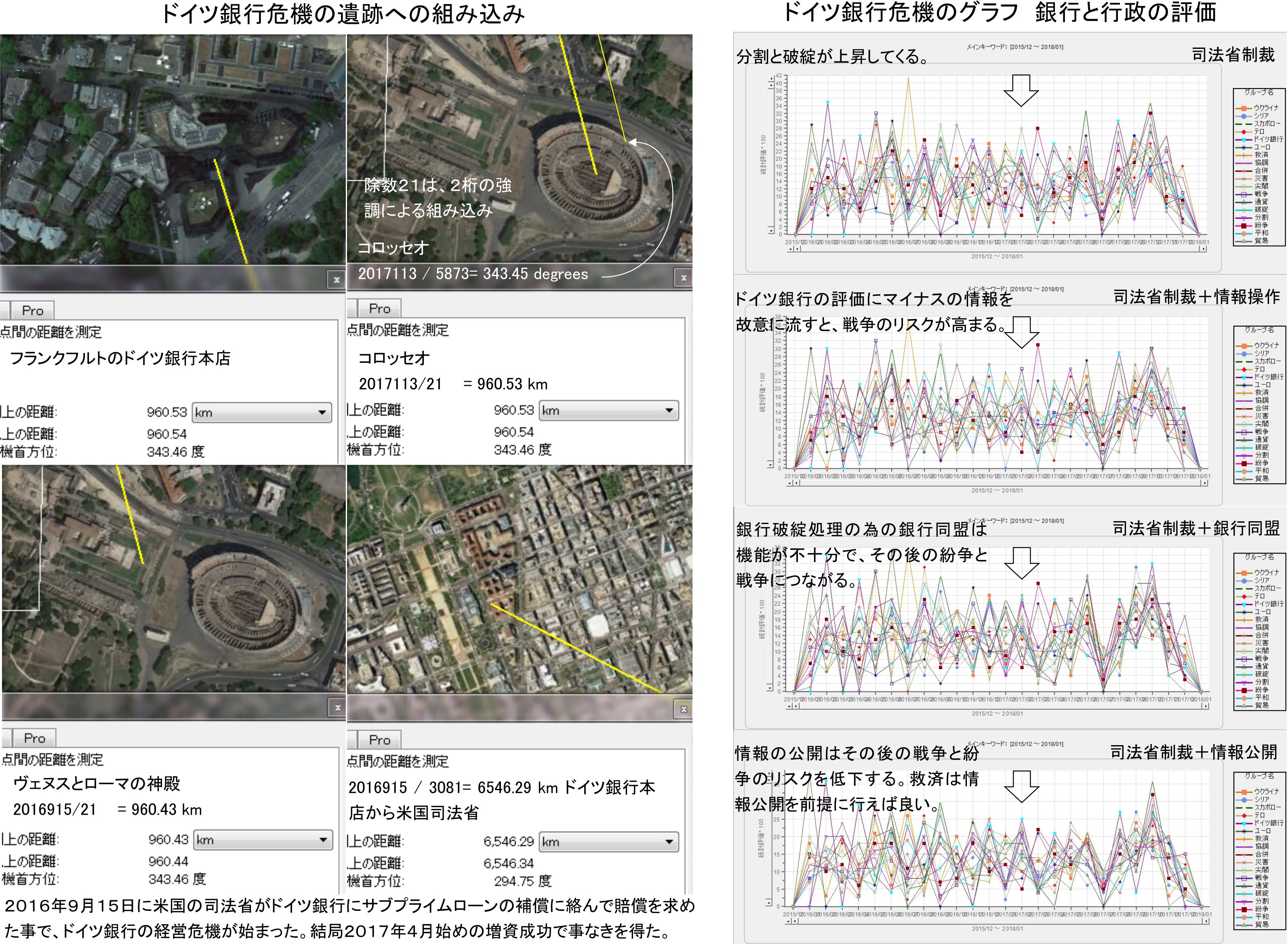 ドイツ銀行危機は米国司法省がドイツ銀行から高額の賠償金を請求する話が流されたので、遺跡に関連事項を調べたところでその状況が確認出来た物です。当時の大統領選挙でヒラリー氏が勝っていれば、その影響を受けて倒産させられて、ロシアと争うヨーロッパの戦争への流れが追求されるところでした。暗号上にもその選択肢が見えており、この未来が回避出来て良かったと思います。