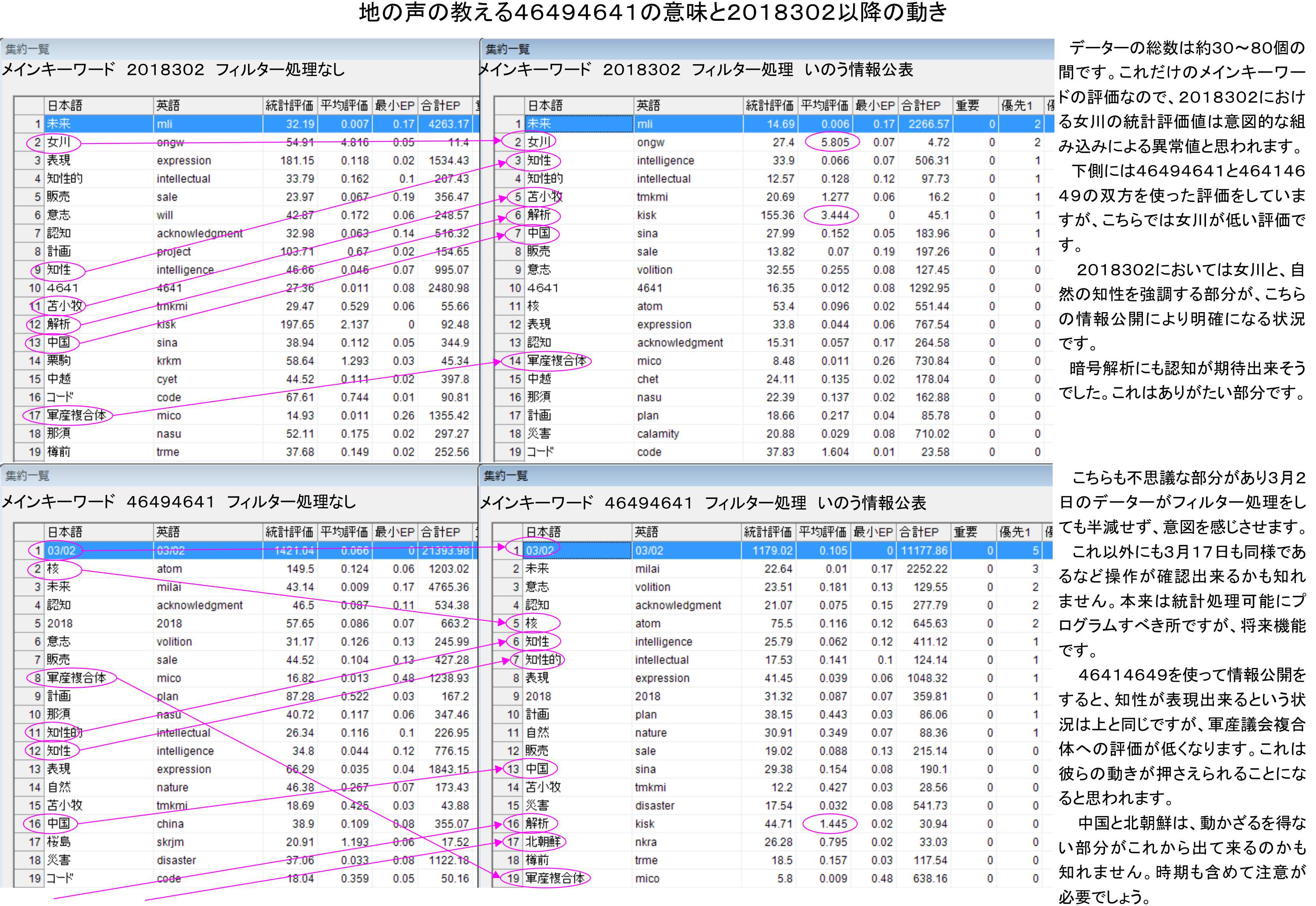 評価した4つの表のデーターの総数は約30~80個の間です。これだけの数量のメインキーワードの評価なので、イラストの上側の2018302における女川の統計評価値は意図的な組み込みによる統計的な異常値と思われます。