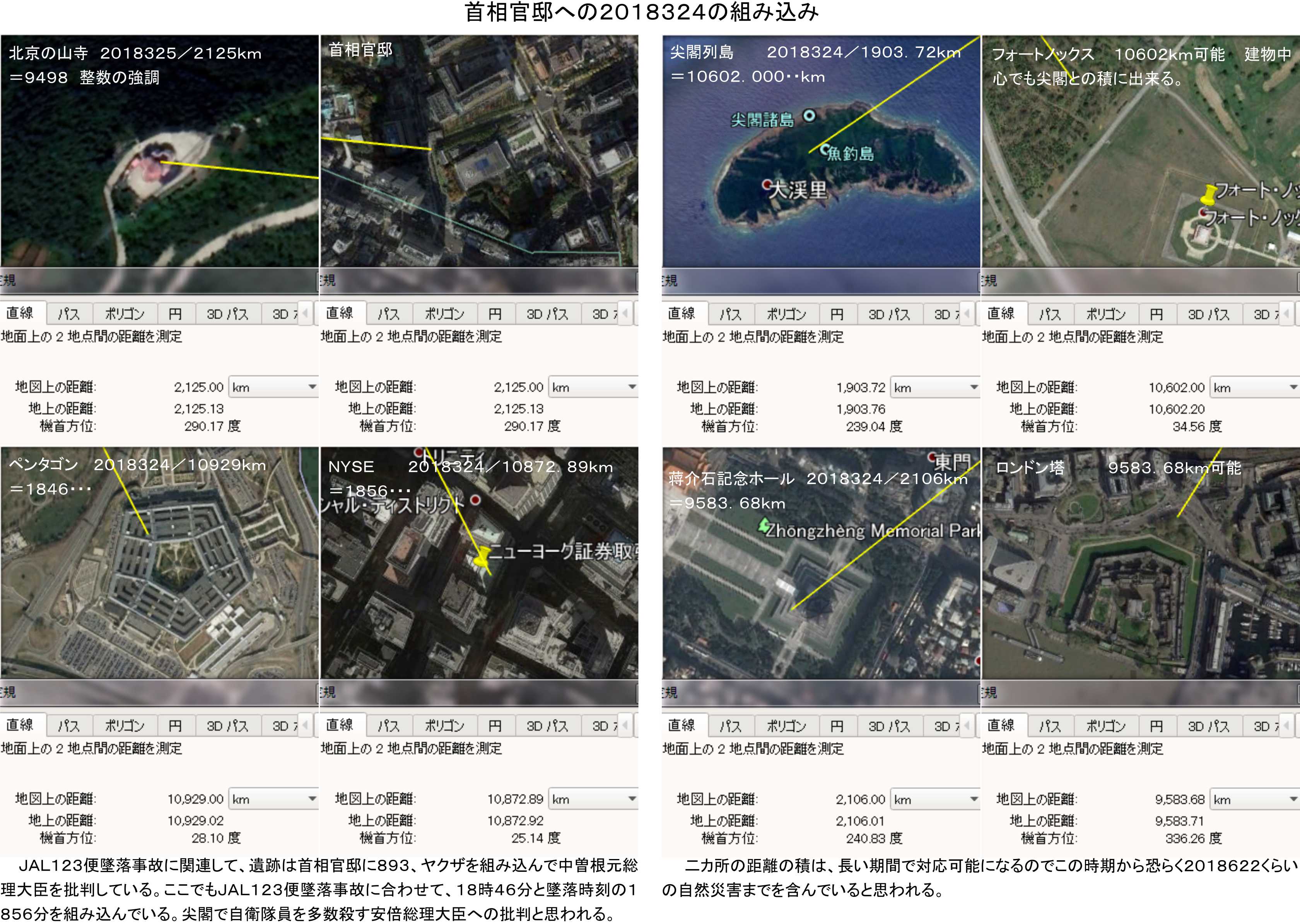 JAL123便墜落事故に関連して、遺跡は首相官邸に893、ヤクザを組み込んで520人を見殺しにした中曽根元総理大臣を批判していました。首相官邸にはここでもJAL123便墜落事故に合わせて、18時46分と墜落時刻の1856分を組み込んでいる状況です。