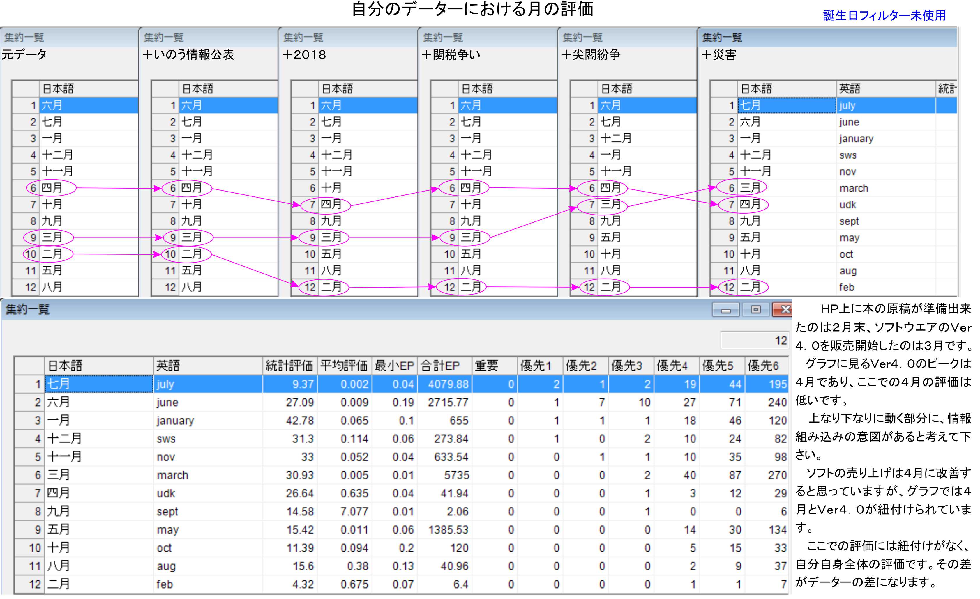 HP上に本の原稿が準備出来たのは2月末、ソフトウエアのVer4.0を販売開始したのは3月です。誕生日抜きでの月の評価を行った物が2枚目のイラストです。