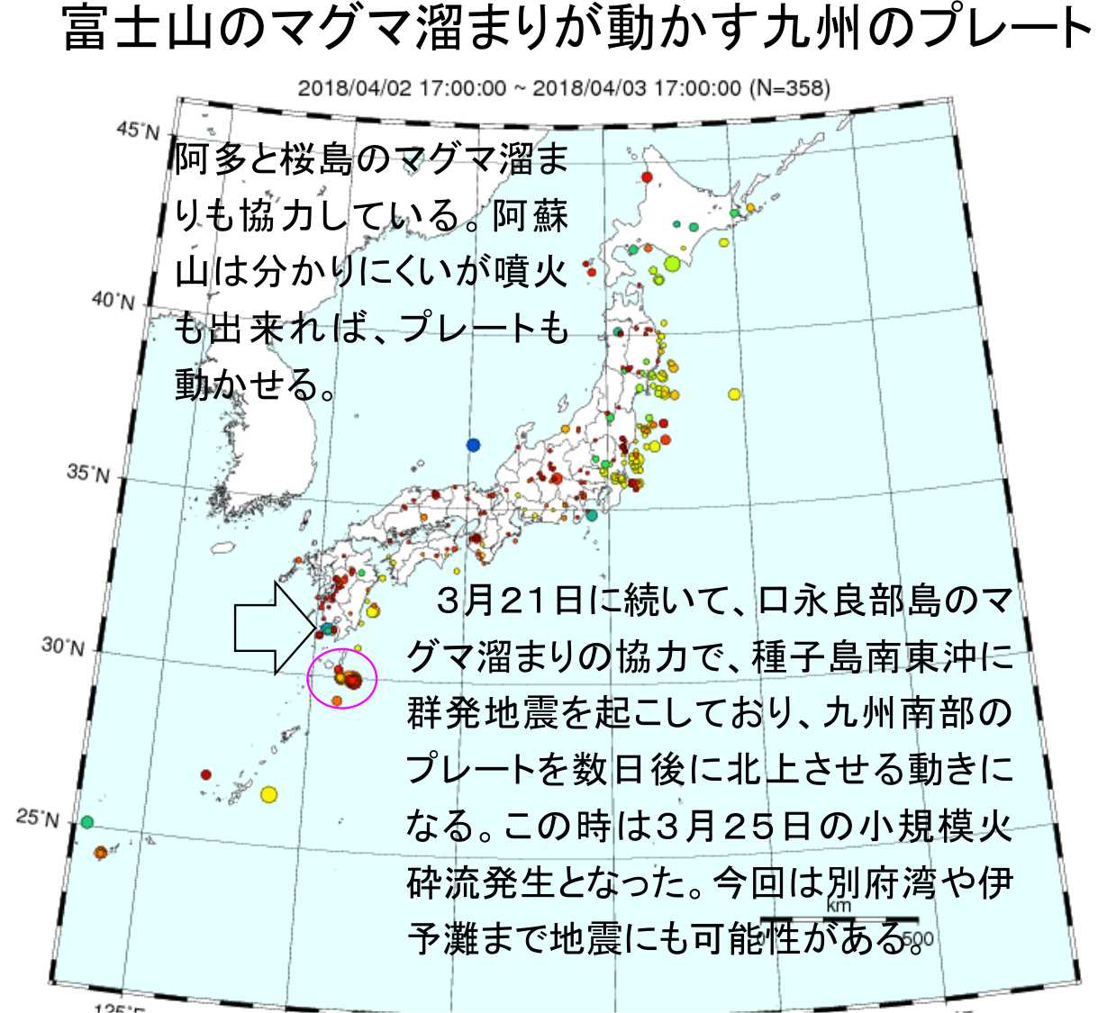 今回の状況ですが、既に新燃岳の噴火により阿蘇山を経由して、中央構造線が動いているでしょう。3月21日には富士山のマグマ溜まりが口永良部島のマグマ溜まりと協力して九州南部を動かしています。この動きが九州南東部の日向灘に地震を増やしており、その先の北側が伊方原発です。