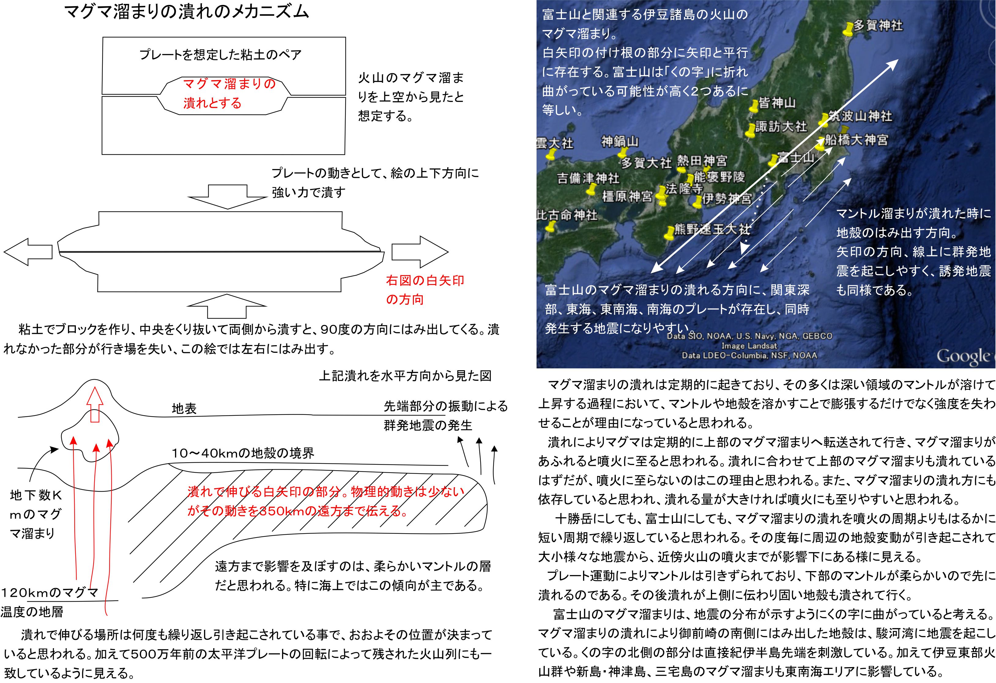 あと、関係するイラスト資料を修正して2枚目に載せています。元イラストは2016年2月末の記事からですが、当時はまだマグマ溜まりの軸線がどこにあるのかを明確に出来ていませんでした。今回の状況で富士山と伊豆東部火山群については明確になったと思われます。新島・神津島、三宅島についても順次明確になると思っています。三宅島は沖縄の東側に群発地震を起こしており、ある程度明確です。日本の南海エリアには数多くのマグマ溜まりが走っており、地震を起こしやすいことは確かでしょう。