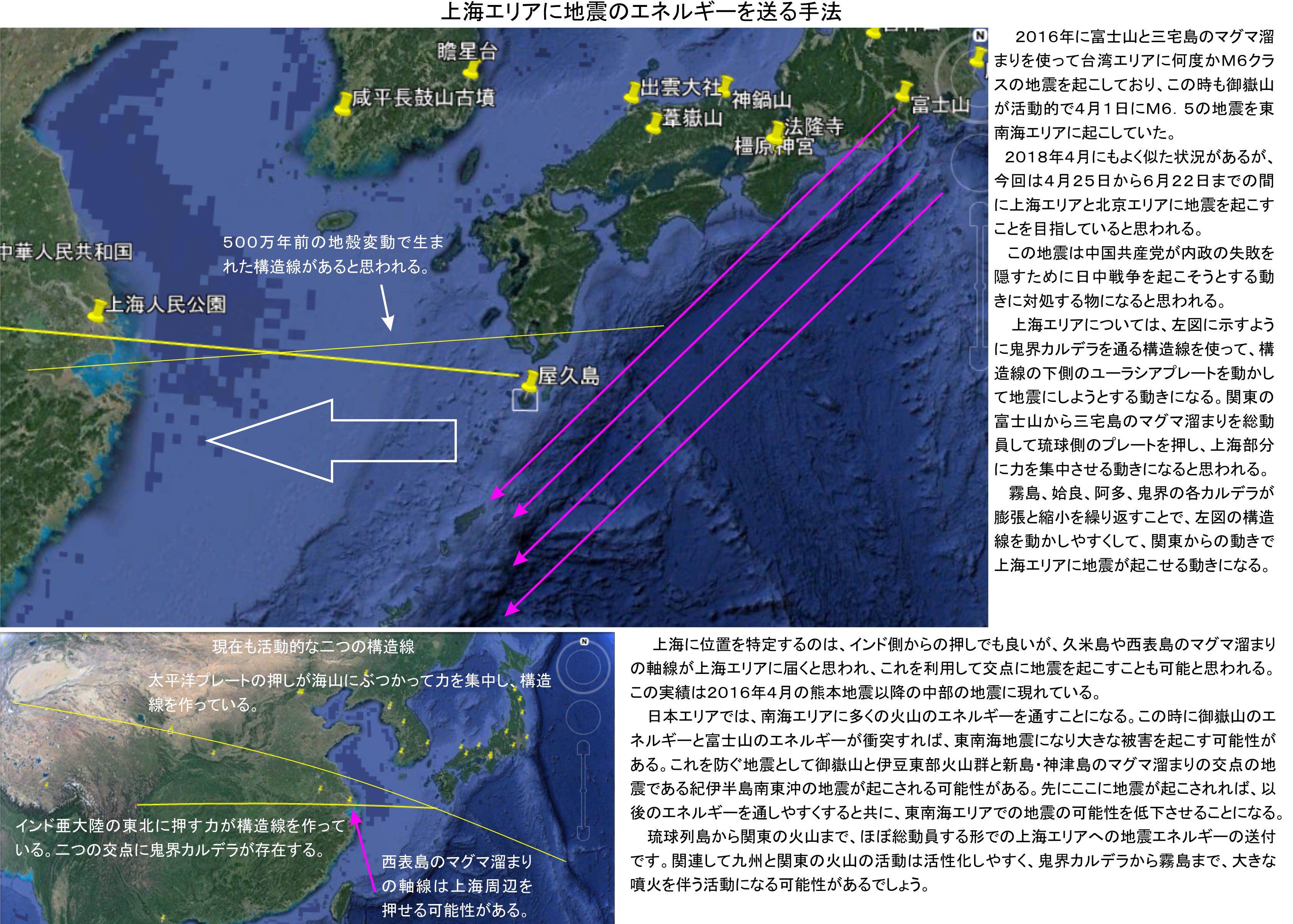 上海エリアについては、イラストの左図に示すように鬼界カルデラを通る構造線を使って、構造線の下側のユーラシアプレートを動かして地震にしようとする動きになるはずです。関東の富士山から三宅島のマグマ溜まりを動員して琉球側のプレートを押し、上海エリア部分に力を集中させる動きになると思われる。