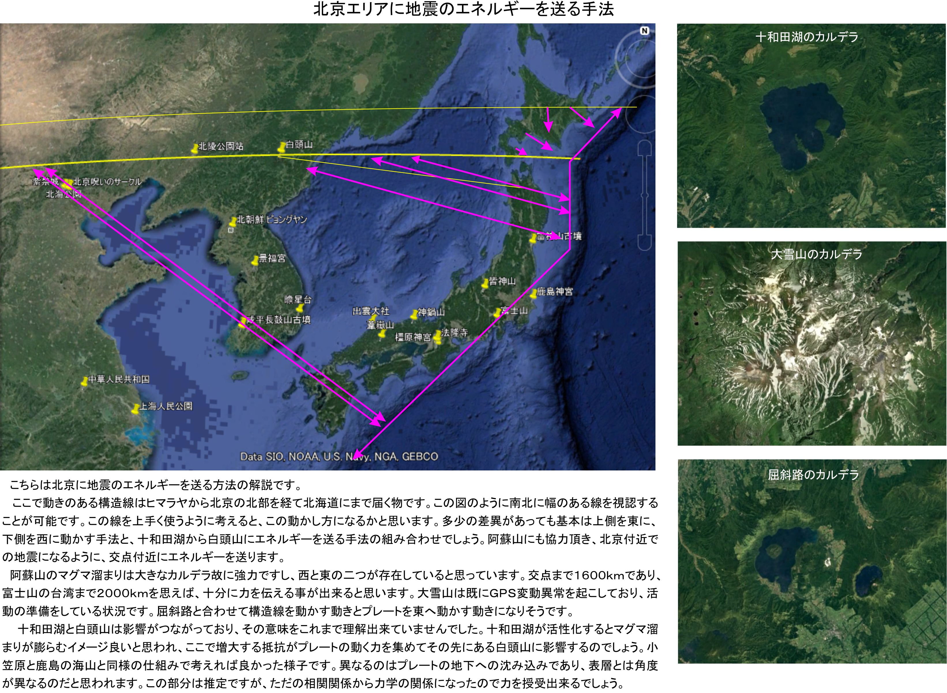 ここで動きのある構造線はヒマラヤから北京の北部を経て北海道にまで届く物です。この図のように南北に幅のある線を視認することが可能です。この線を上手く使うように考えると、この動かし方になるかと思います。多少の差異があっても基本は上側を東に、下側を西に動かす手法と、十和田湖から白頭山にエネルギーを送る手法の組み合わせでしょう。阿蘇山にも協力頂き、北京付近での地震になるように、交点付近にエネルギーを送ります。