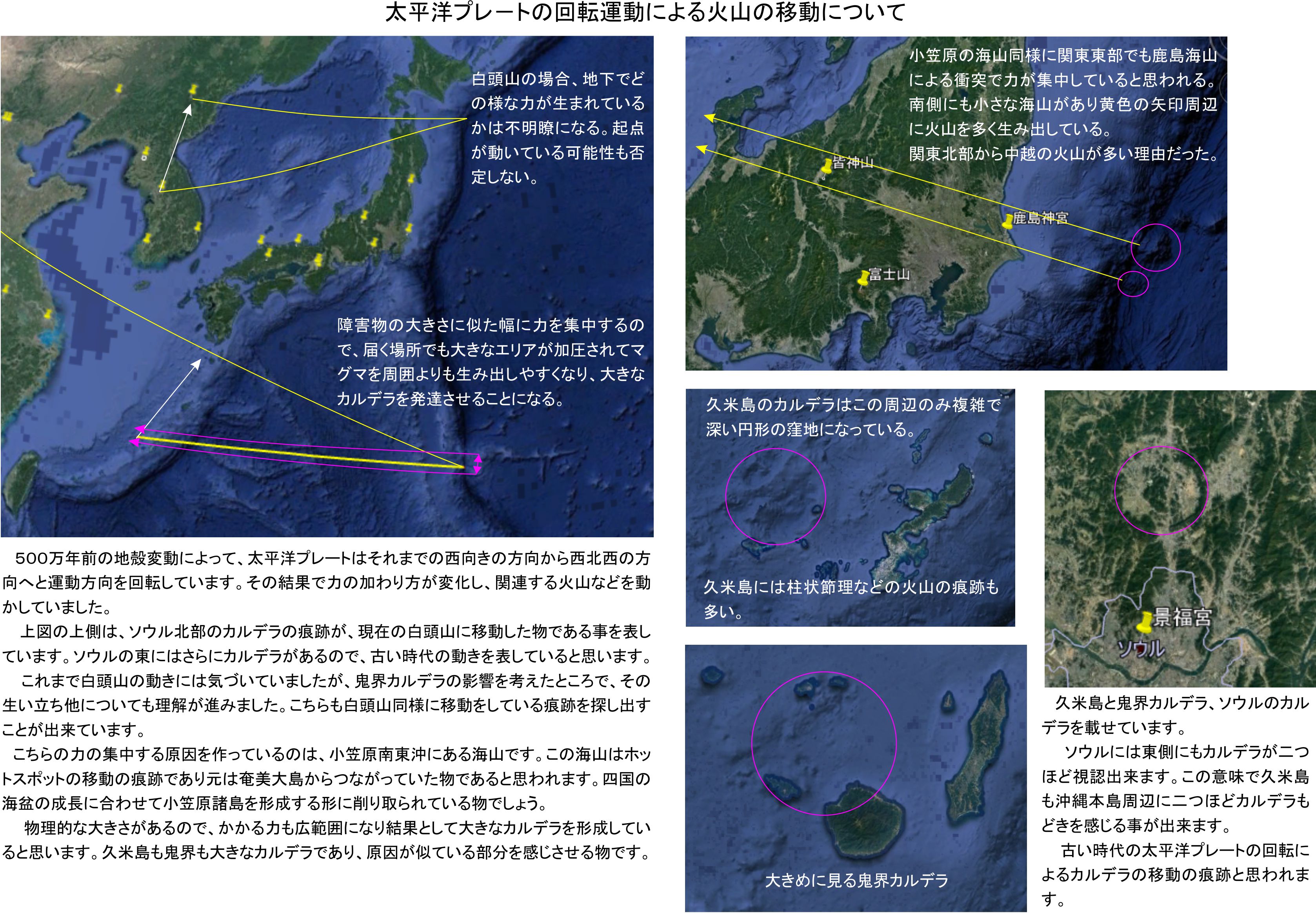 これまで白頭山の動きには気づいていましたが、鬼界カルデラの影響を考えたところで、その生い立ち他についても理解が進みました。こちらも白頭山同様に移動をしている痕跡を探し出すことが出来ています。鬼界カルデラの元の位置である久米島にも沖縄本島周辺に二つほどカルデラもどきを感じる事が出来ます。
