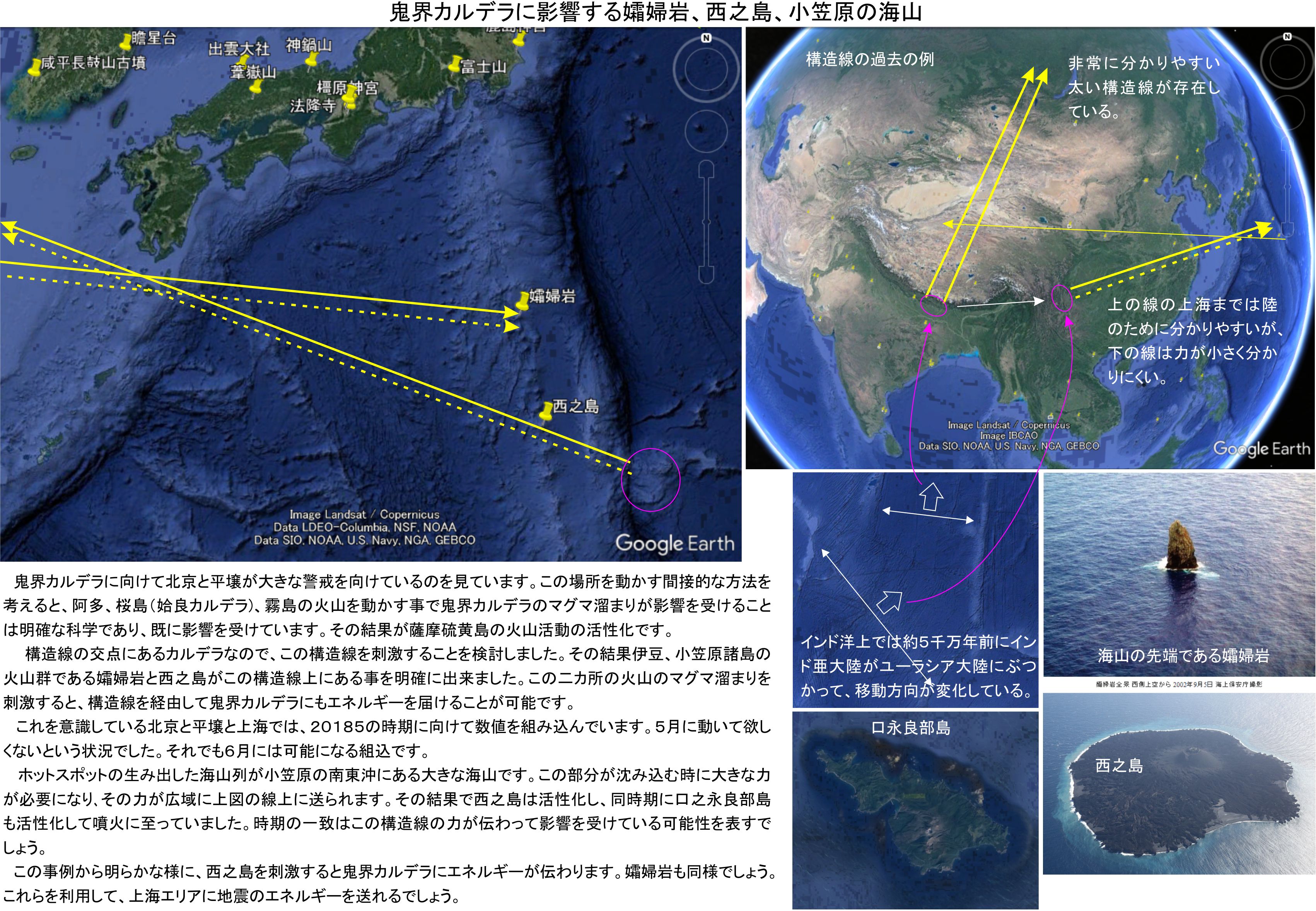 構造線の交点にあるカルデラなので、この構造線を刺激することを検討しました。その結果伊豆、小笠原諸島の火山群である孀婦岩と西之島がこの構造線上にある事を明確に出来ました。この二カ所の火山のマグマ溜まりを刺激すると、構造線を経由して鬼界カルデラにもエネルギーを届けることが可能です。孀婦はそうふと読んで寡婦の意味です。