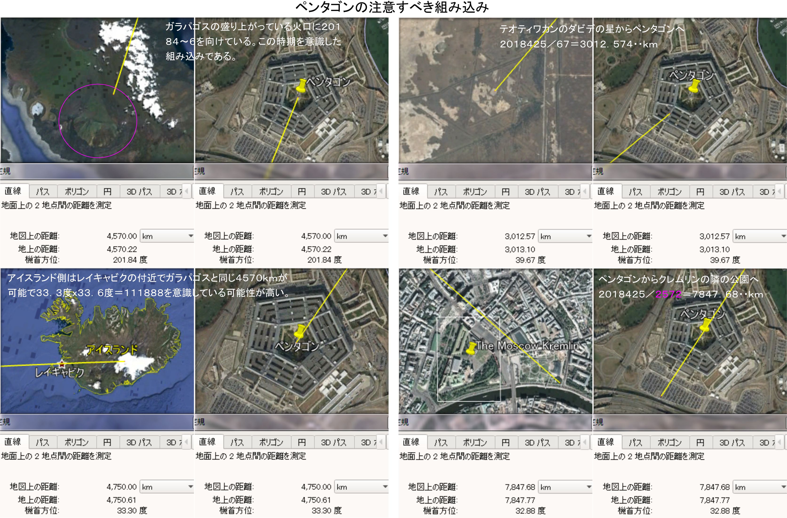 この反対側になるアイスランド側は、レイキャビクの付近でガラパゴスと同じ4570kmが可能でした。特徴がないのですが強いて上げると33.3度x33.6度=111888を意識している可能性が高いと感じました。これは善の側の三宅島への組み込みに111888があったのでこの点からの類推です。