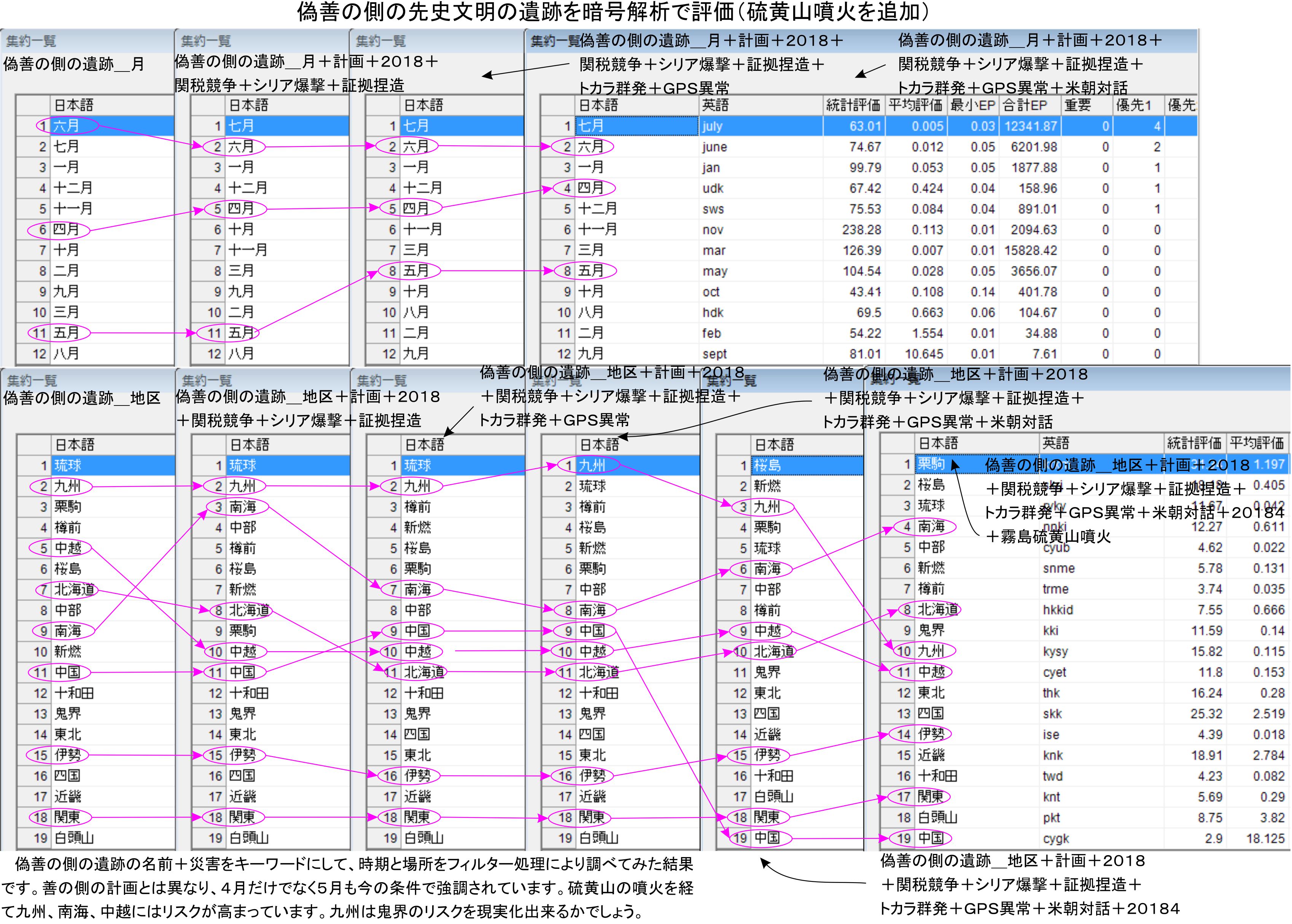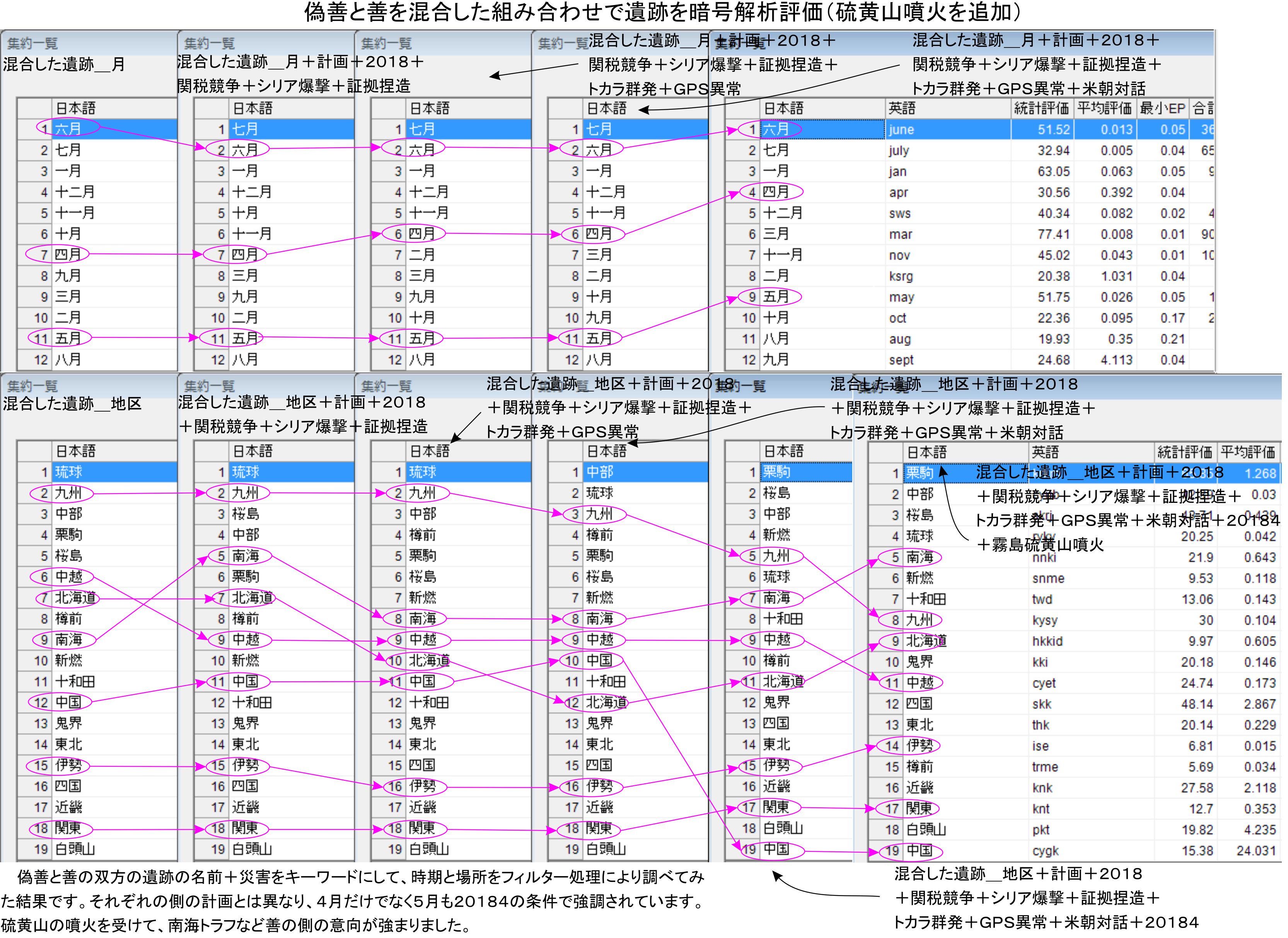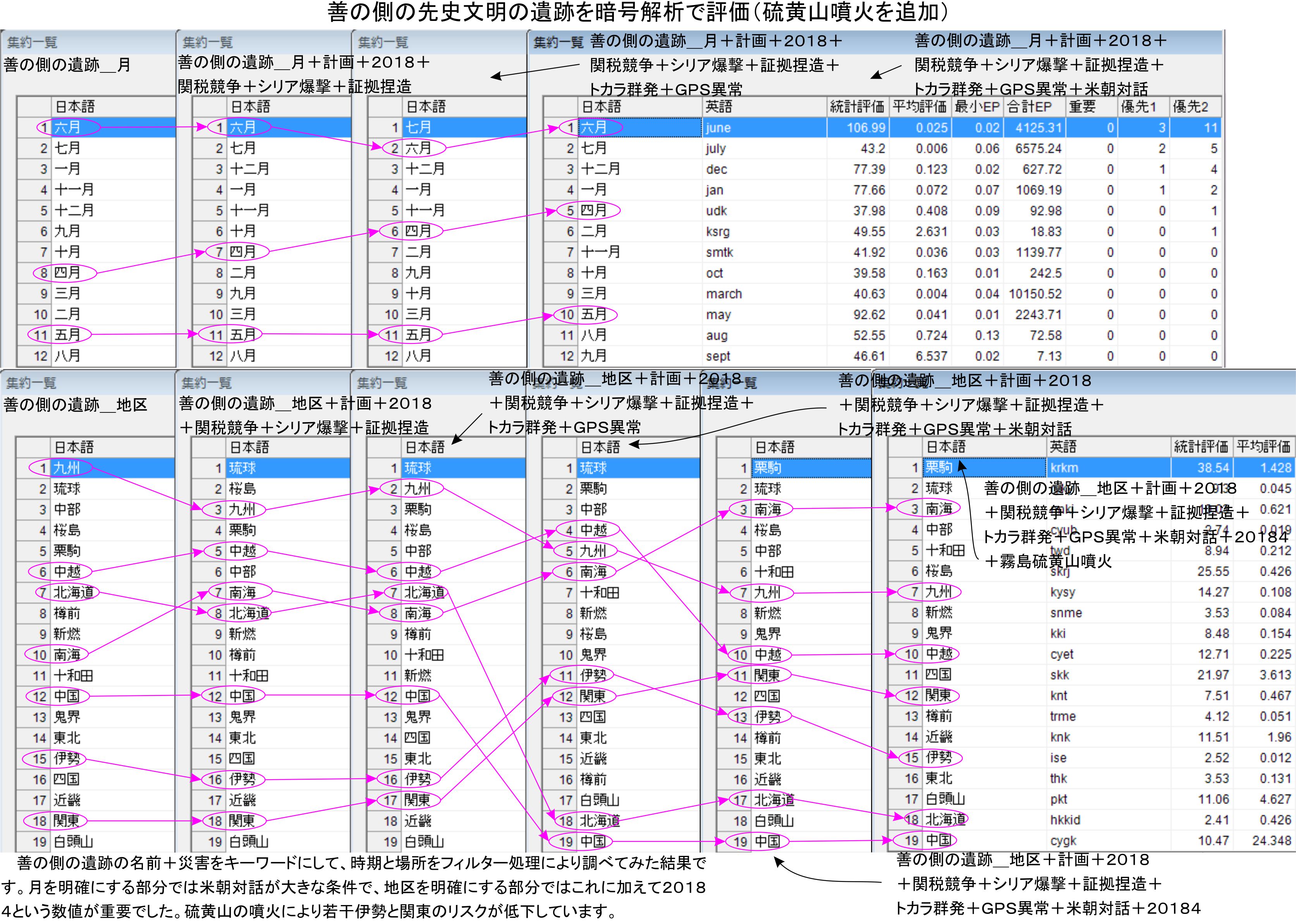 暗号解析側にも硫黄山の噴火を追加しました。月の評価は十分と思うので未処理ですが、時間の都合もあるので無理はしません。この先の作業の中で確認をする事になると思います。無理してひっくり返っても資金繰りで苦しめられるだけであり、ここまで来てもまだ先延ばしばかりであり、自分たちの争いにしか目が行かない感じです。2018425までには世界の政治と災害まで進める様に配慮したいと思います。