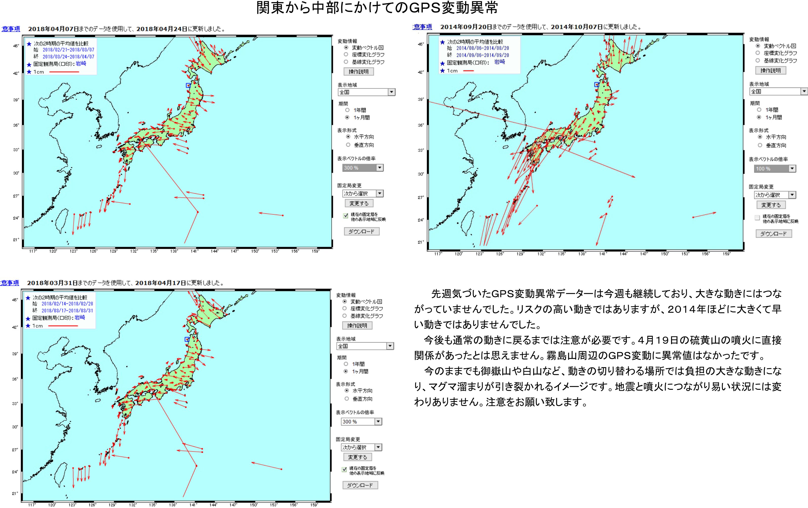 先週気づいたGPS変動異常の続きが確認出来ました。大きな変化にはつながりませんでしたが、現在も先週のレベルの動きを継続しており、中部のリスクは高いでしょう。関東から九州まで影響することなので注意をするしかない現実です。霧島山硫黄山の関連にはGPS変動異常はなく、この噴火には大きな影響はなかったと思われます。噴火は桜島と阿多の動きで起こされている一連の流れに感じます。
