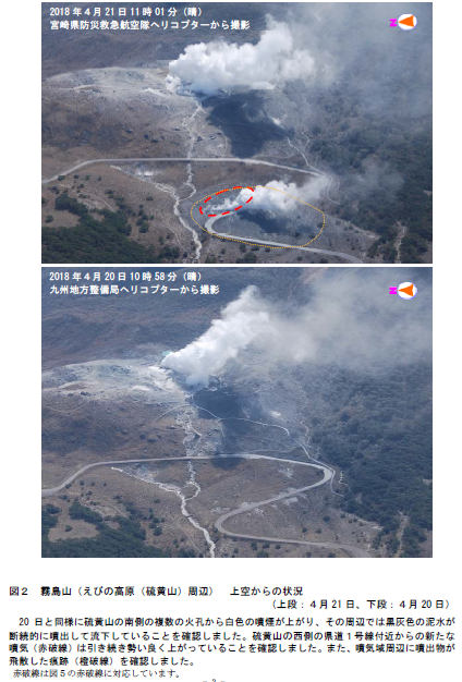 もう一点が霧島山硫黄山の噴火の状況の変化です。これまでの硫黄山本体部分の噴火口から約400m程はなれた部分に新たに噴火口が生まれようとしています。現状は水蒸気を大量に噴出しており、活動状況の変化を見せています。