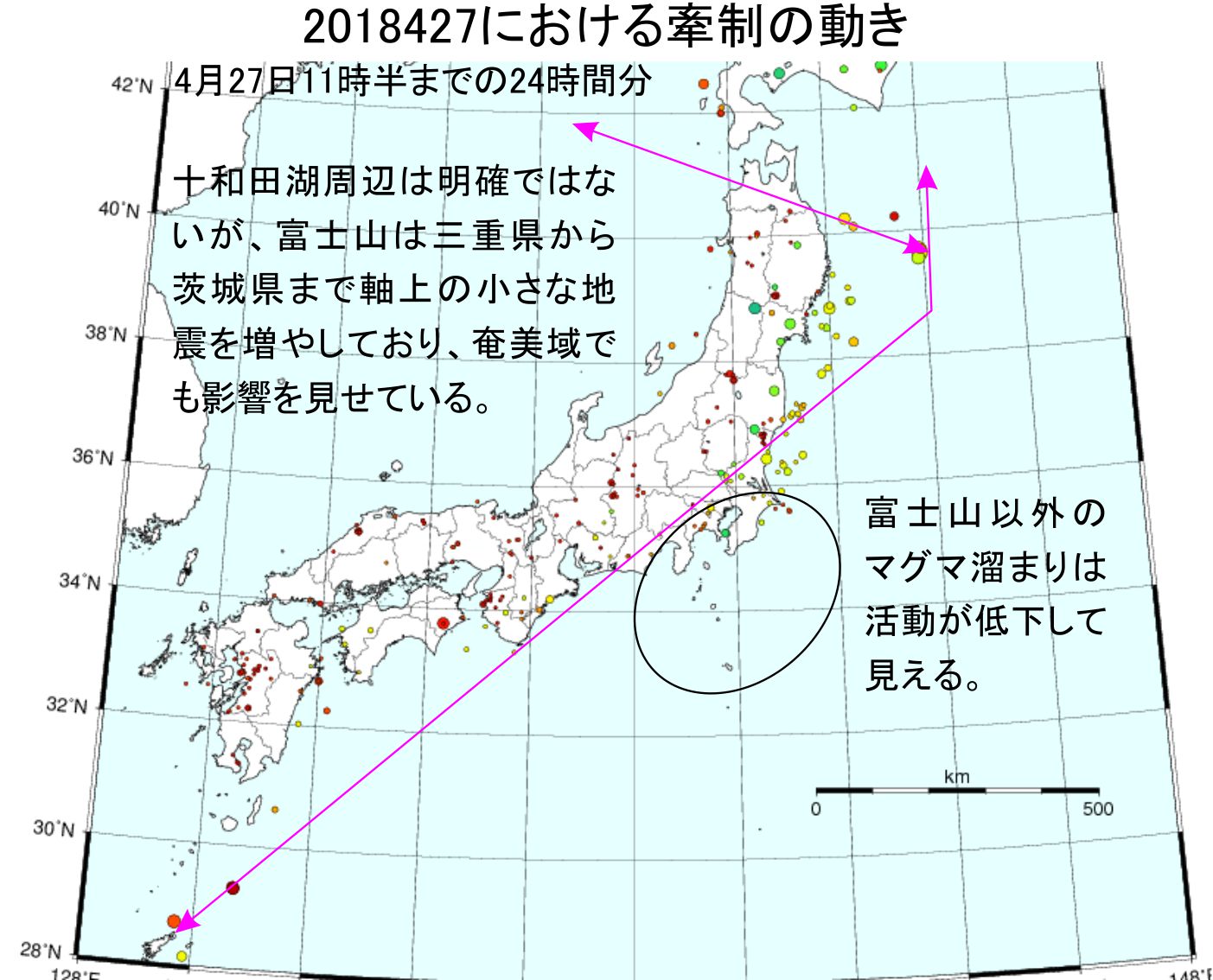 本日は悪天候もあるのでこのまま動きなしで進む可能性があるでしょう。結局大きな変化もないままに2018425を迎えることになり、新島・神津島の起こした群発地震の意味を待つことになります。