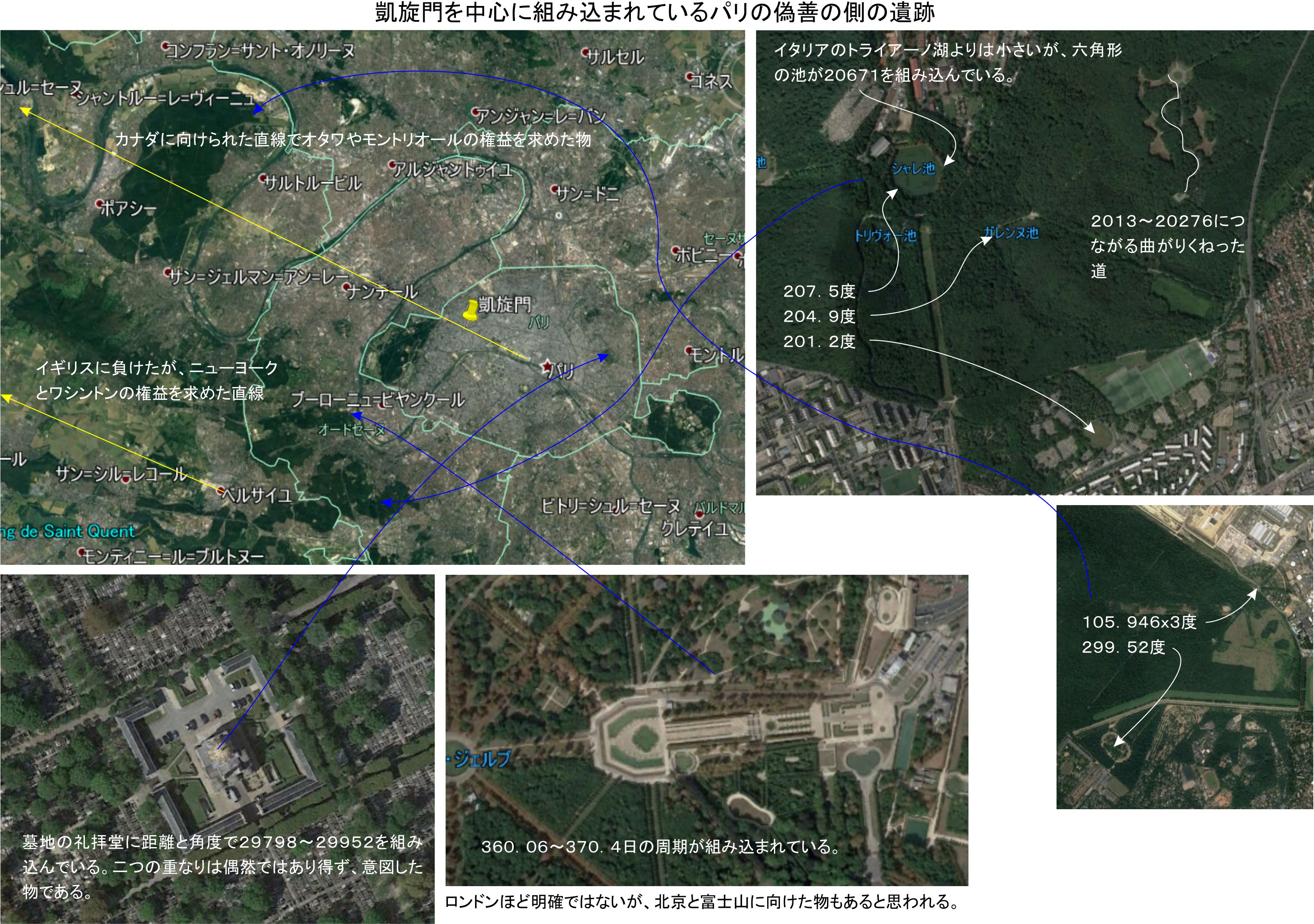パリは凱旋門が計測中心です。この場所の都市計画の特徴は、凱旋門を通る道の角度に、カナダのモントリオールやオタワへの角度が組み込まれている事と、もう一つベルサイユ宮殿を通る直線も存在し、こちらはニューヨークとワシントンを組み込んでいました。