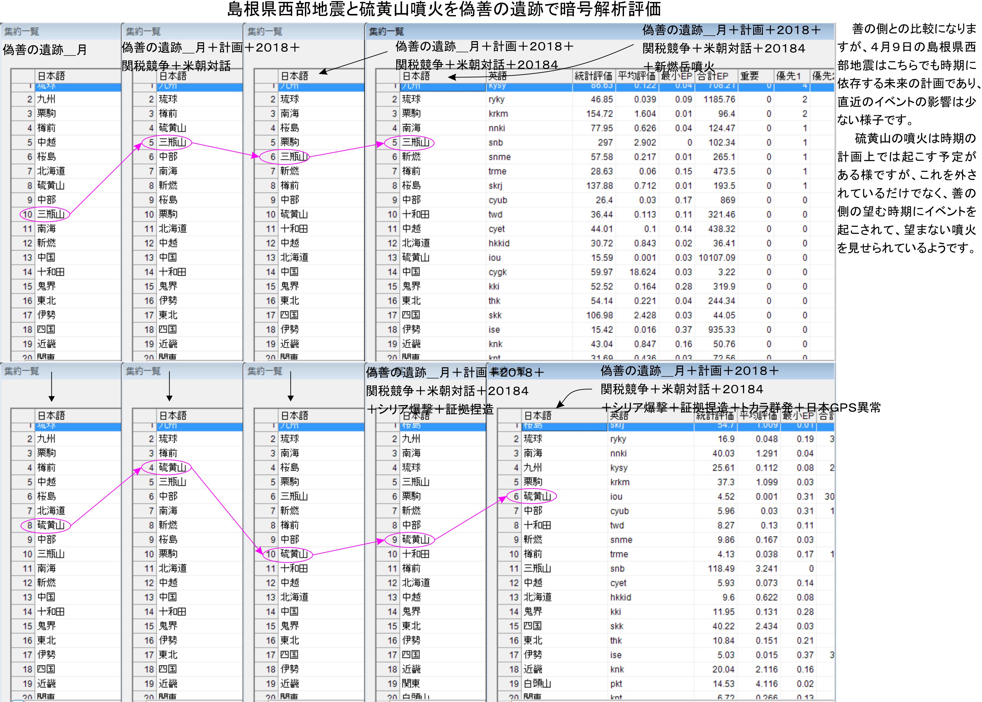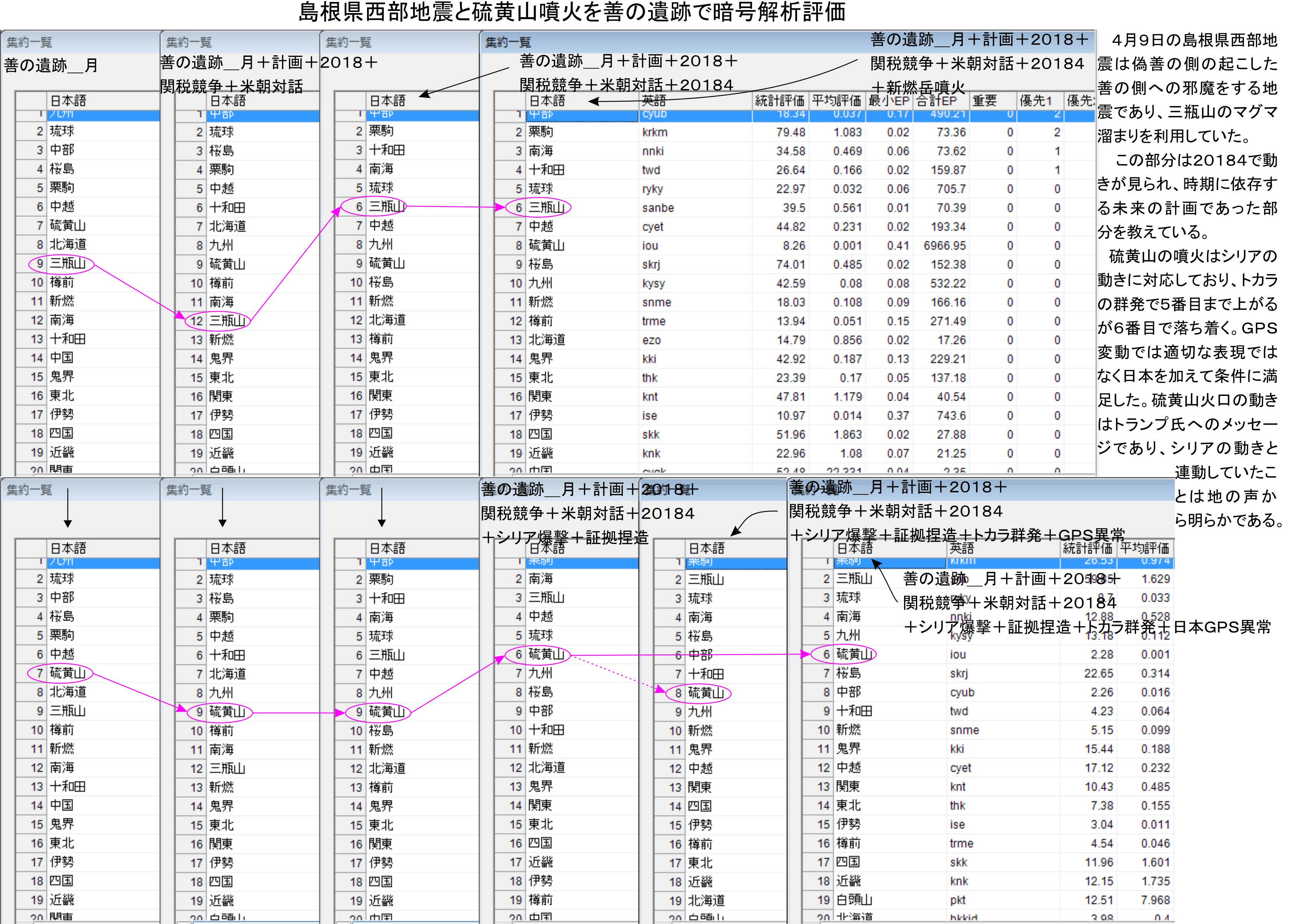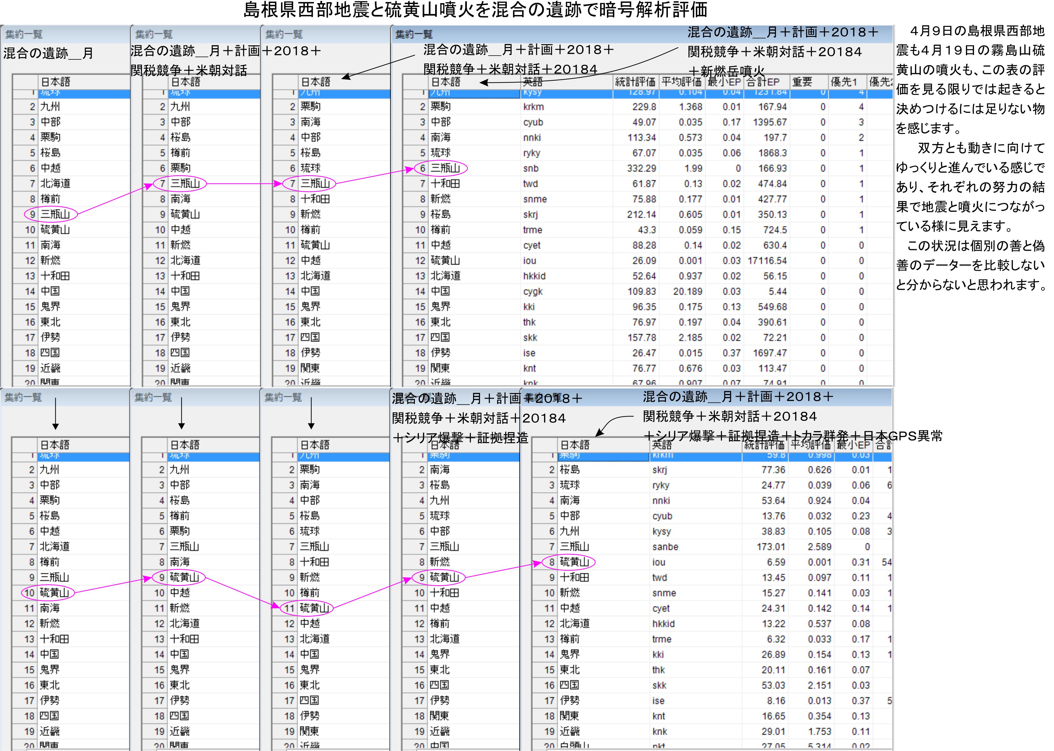 暗号解析にも情報を公表してきました。この中で4月9日の島根県西部の地震と4月19日の霧島山硫黄山の噴火については、暗号解析上でどの様にデーターが表現されているのかを調べる事が出来ました。