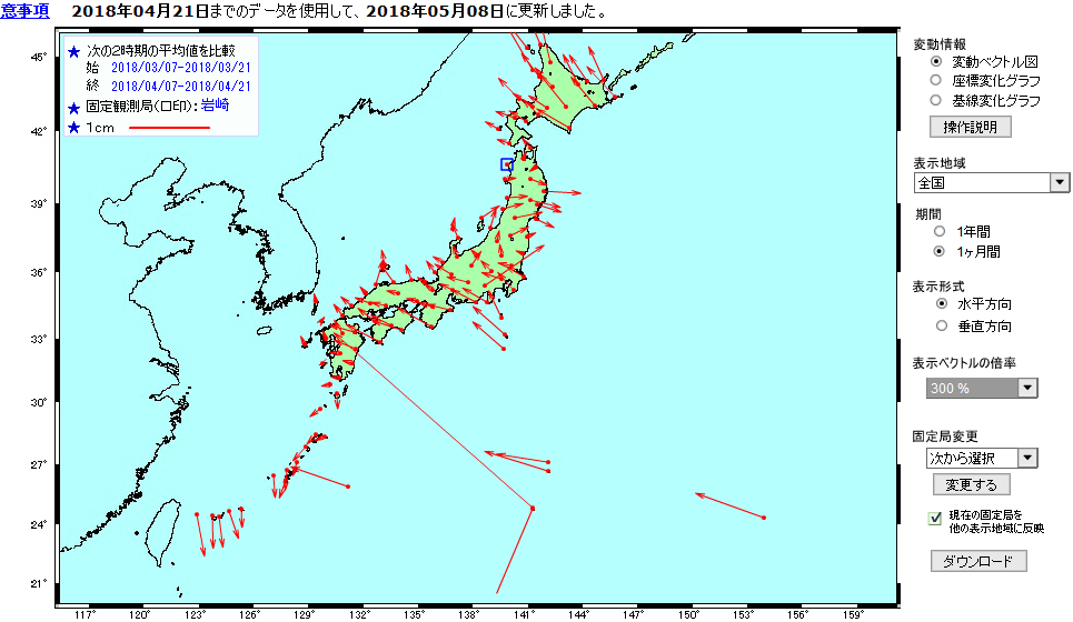 GPS変動データーが公表されて、先週からの変化が改善に向かっている部分が明確になりました。九州から関東にかけての動きは緩和されつつありますが、リスクがなくなったわけではなく様子見は必要です。