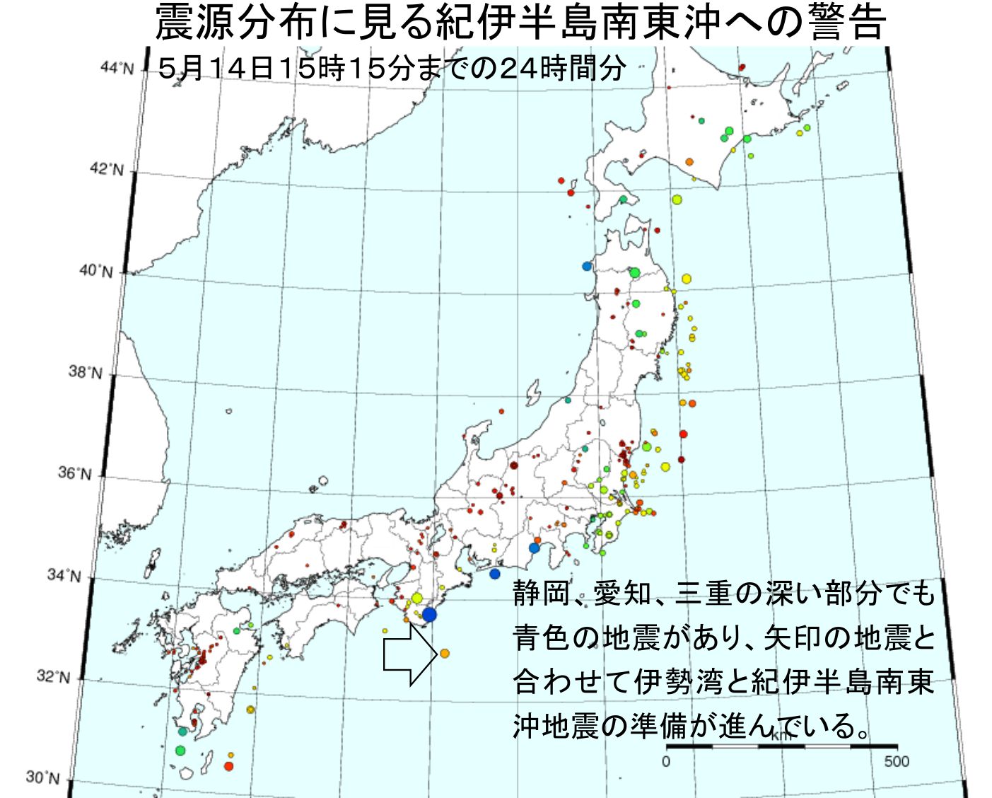これを加味して考えると、関西エリアで明日の前後にM4~5位の地震が起きると、中央構造線の動きを促す事になります。和歌山県北部でも良いですが、このエリアで少し大きく揺れがあると、中央構造線を伊勢湾でも動かす事になり、伊勢湾の地震を大きくする効果を持つでしょう。