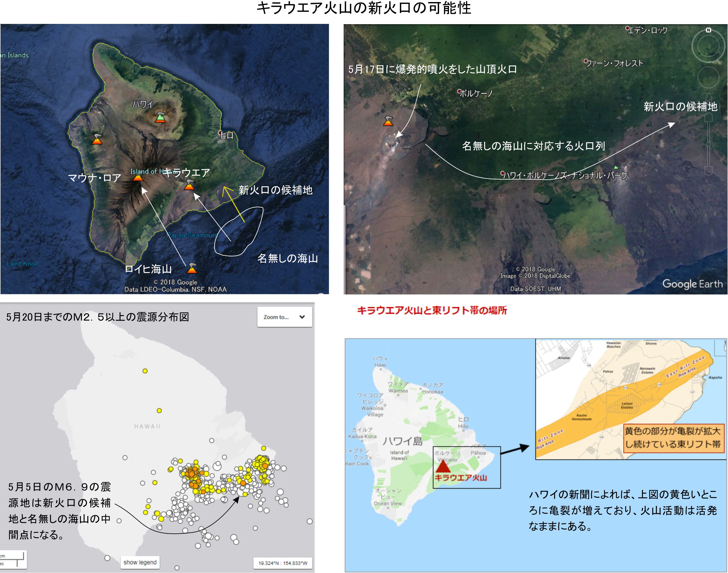 ハワイの新聞記事では、18日現在もまだ新しい亀裂が生まれて溶岩が吹き出しているとのことです。震源分布図などがあって、こちらの検討に利用出来る物でした。