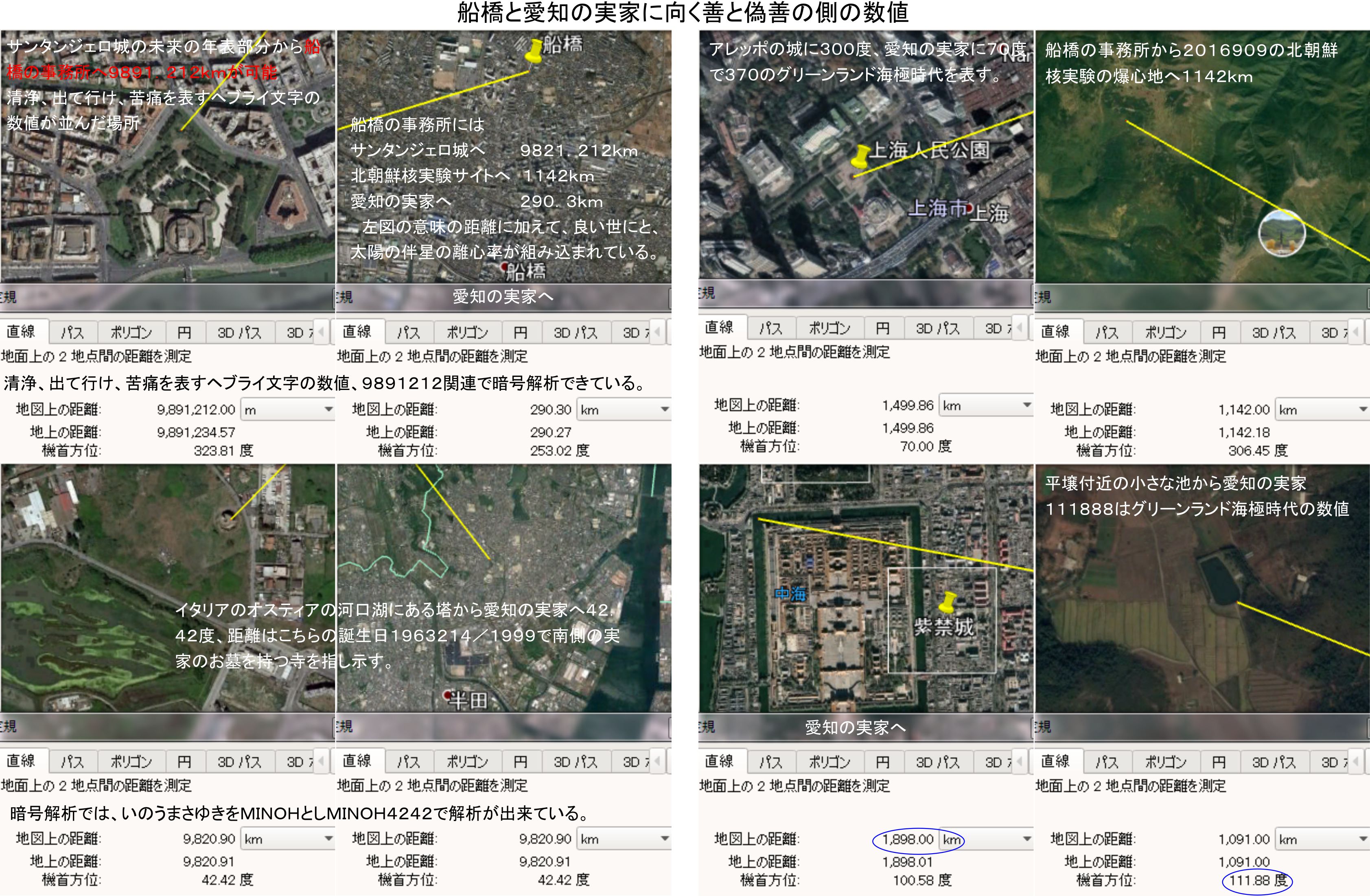 ペンタゴンの位置は恐らく911同時多発テロをメインに据えての位置だと思われ、こちらの動きなど歯牙にもかけていないでしょう。決められた位置に合わせて守護霊さん達が今の船橋の事務所を選んでおり、恐らく偶然でサンタンジェロ城から9891.212kmが可能だったのでしょう。双方ともそれなりの広さがあるので、船橋における候補地から今の事務所の場所を選んだのだと思われます。