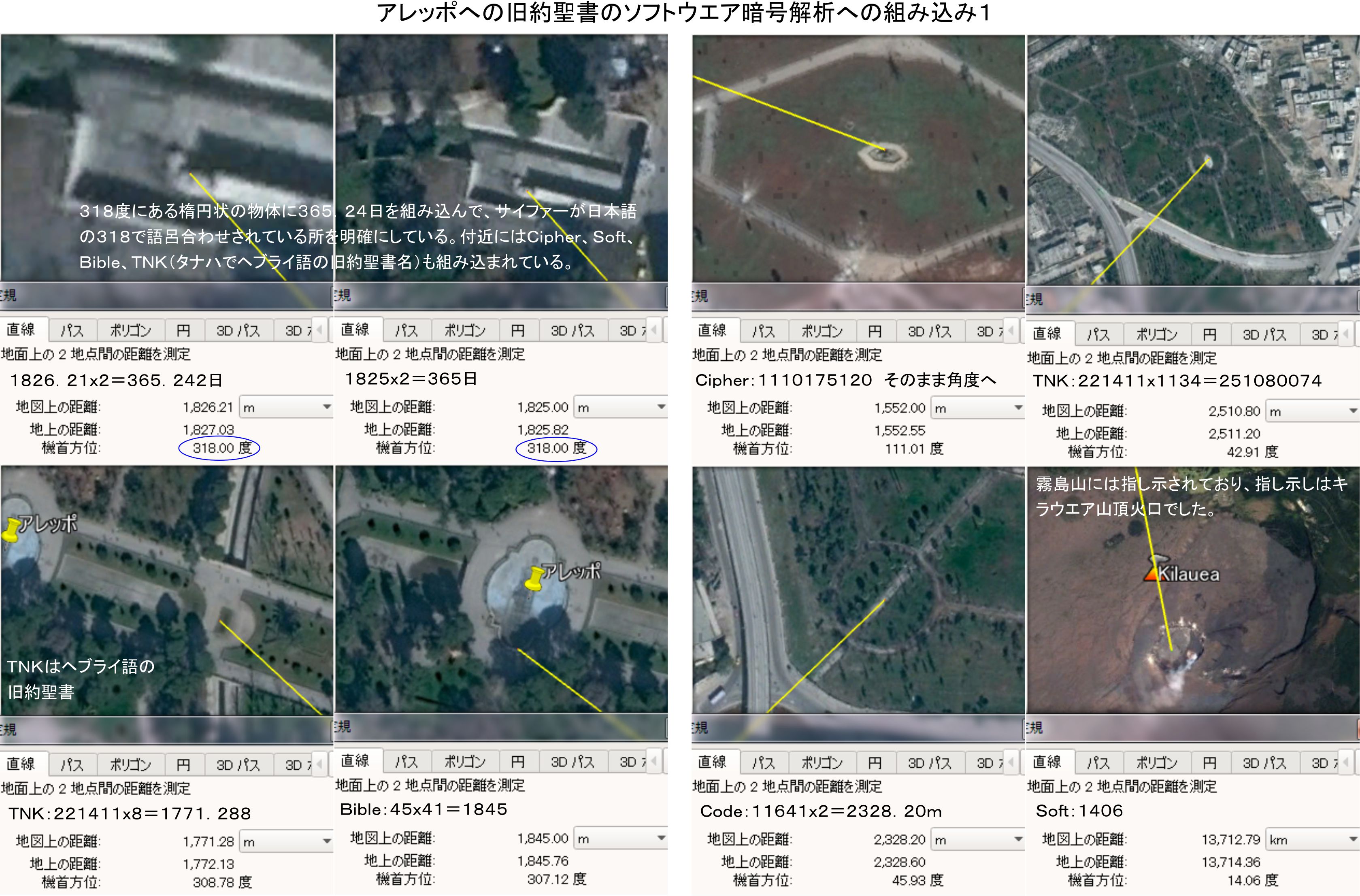 新燃岳、硫黄山の新旧火口から、アレッポと岩のドームの差の計算により距離は118731/3、角度は3.18度となり、暗号解析を意識して伝えています。318は日本語のサイファーで暗号の意味です。