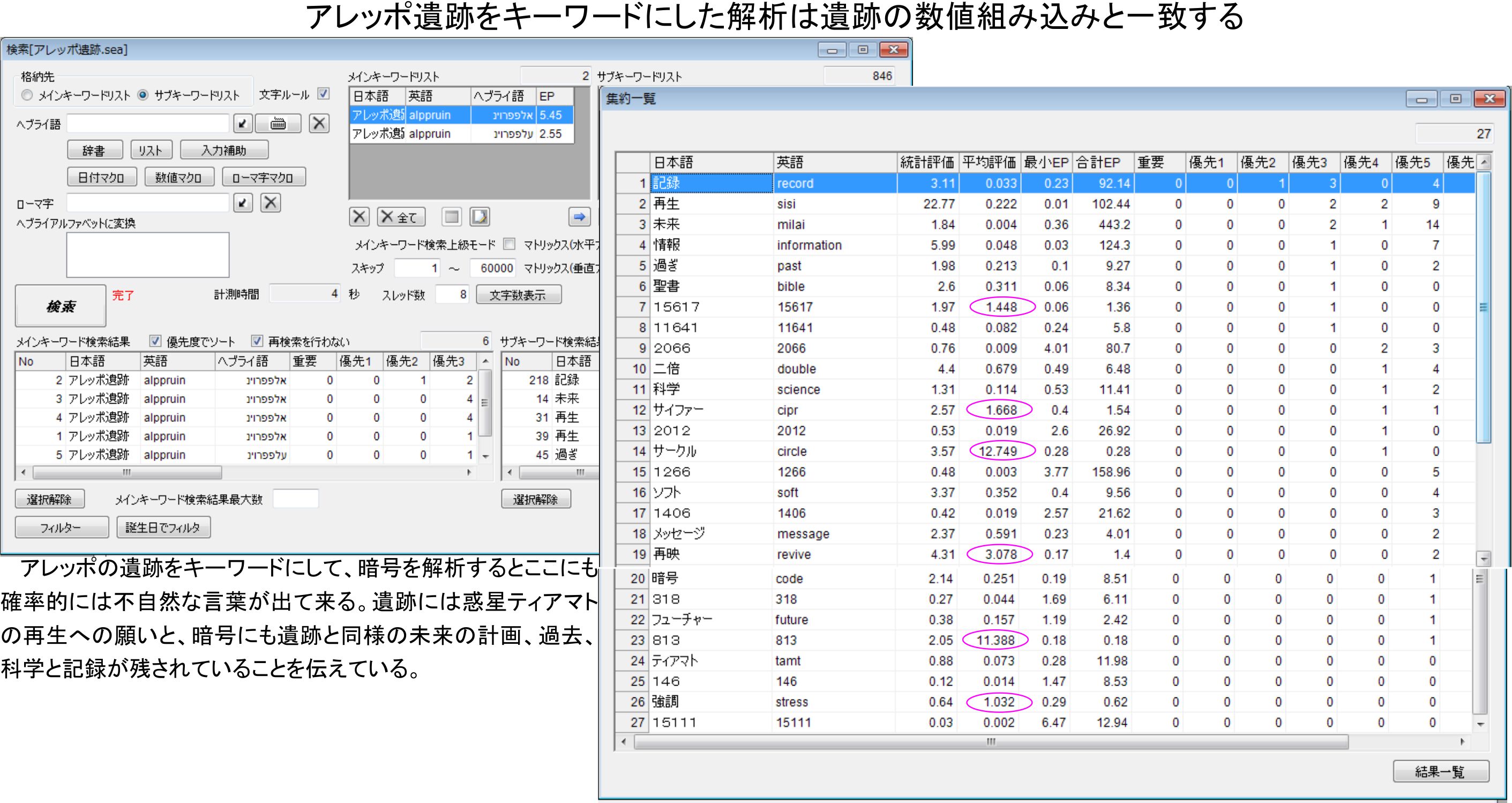 暗号解析におけるアレッポでは、メインキーワードは期待値通りの出現数で、内部のサブキーワードが多少操作されている感じでした。この続きをもっと調べる時が来る様子であり、解析手法の進歩をここで確認することになると思っています。