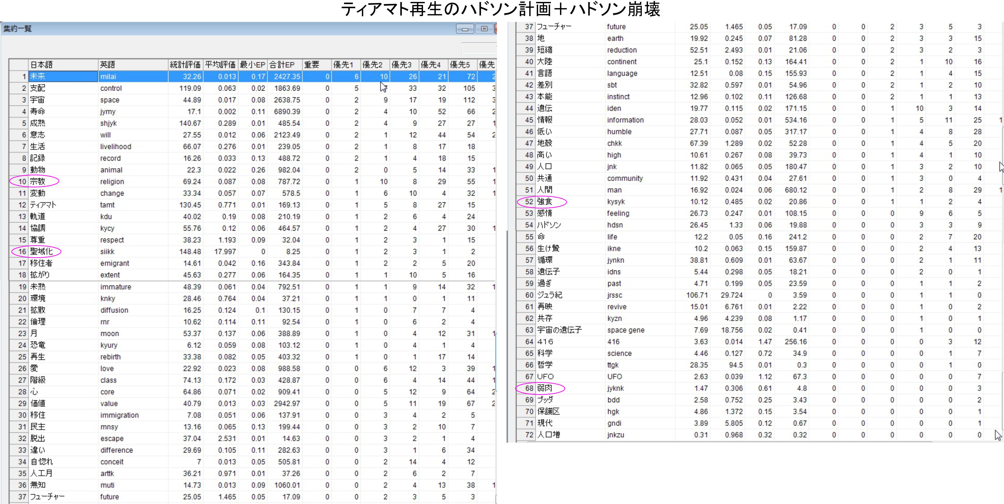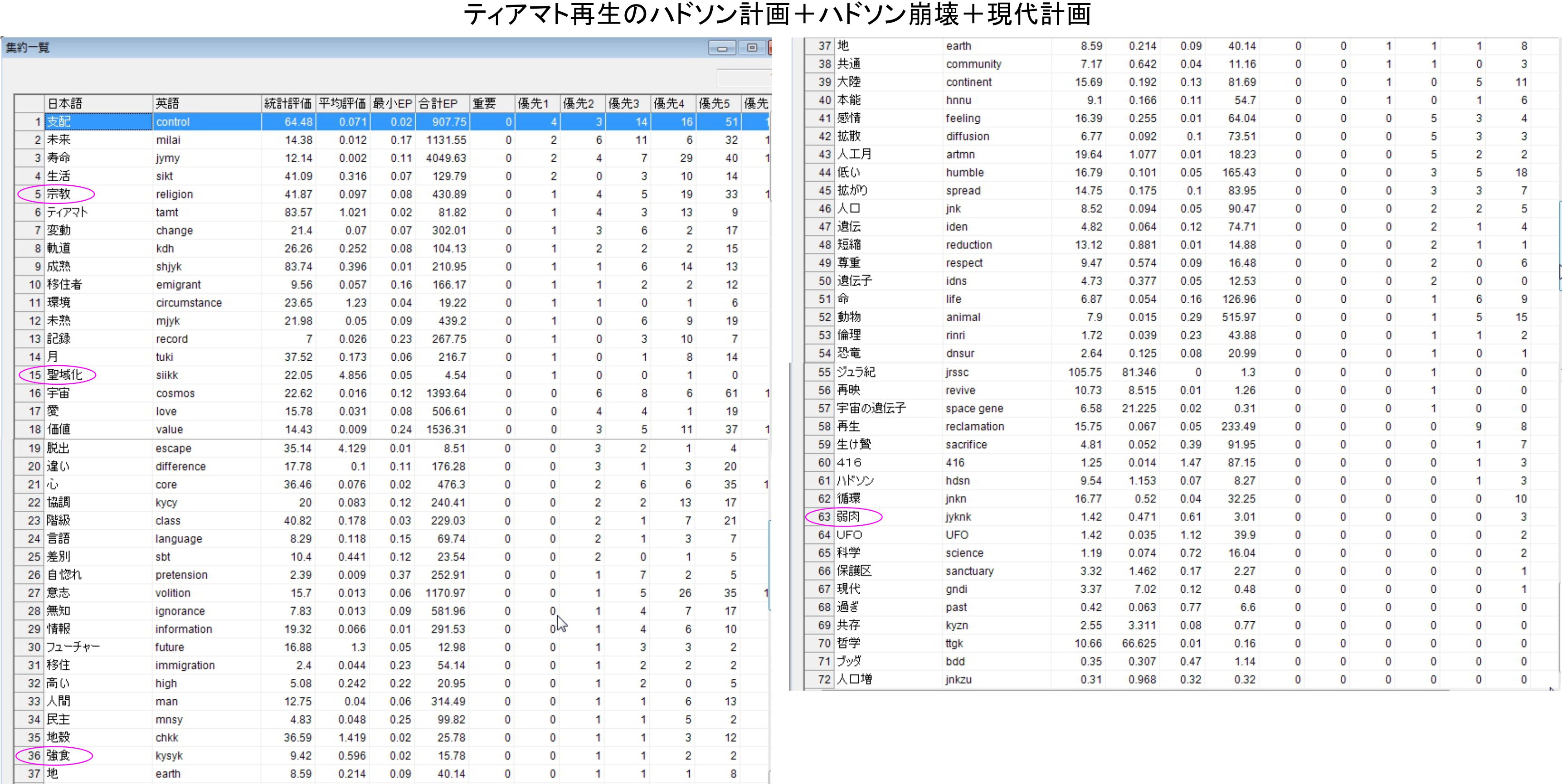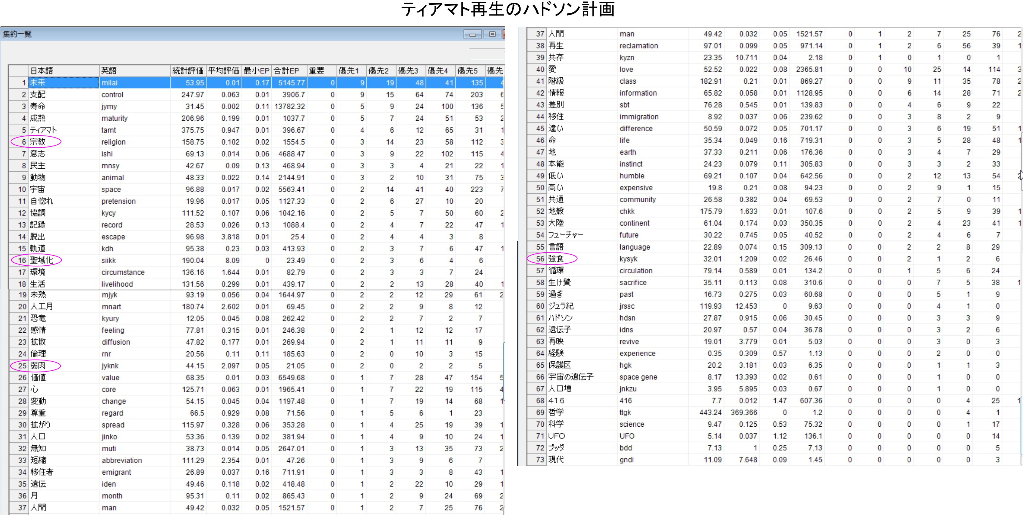 3種類の解析結果を比較すると、当時の状況が見えてきます。まず、一番目と二番目では先頭に来る言葉が未来でした。計画は未来の物であり、ハドソン湾極時代に再生まで進む予定ではなかった様子です。実際に小惑星セレスの周辺にティアマトの破片を集める事もなければ、火星と金星のコロニーを再生する事も無着手でしょう。