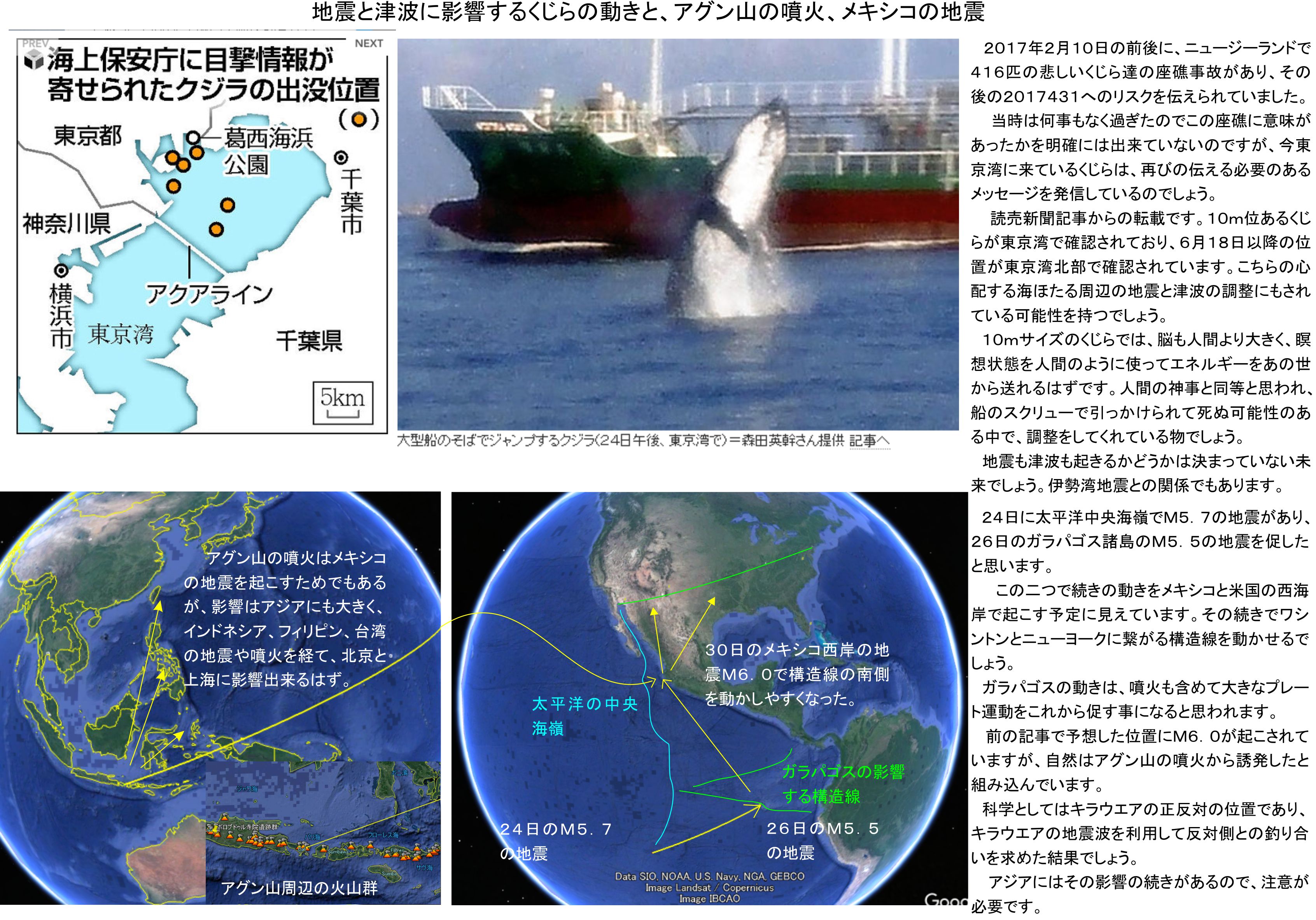 イラストは読売新聞記事からの転載です。10m位あるくじらが東京湾で確認されており、6月18日以降の位置が東京湾北部で確認されています。こちらの心配する海ほたる周辺の地震と津波の調整にもされている可能性を持つでしょう。