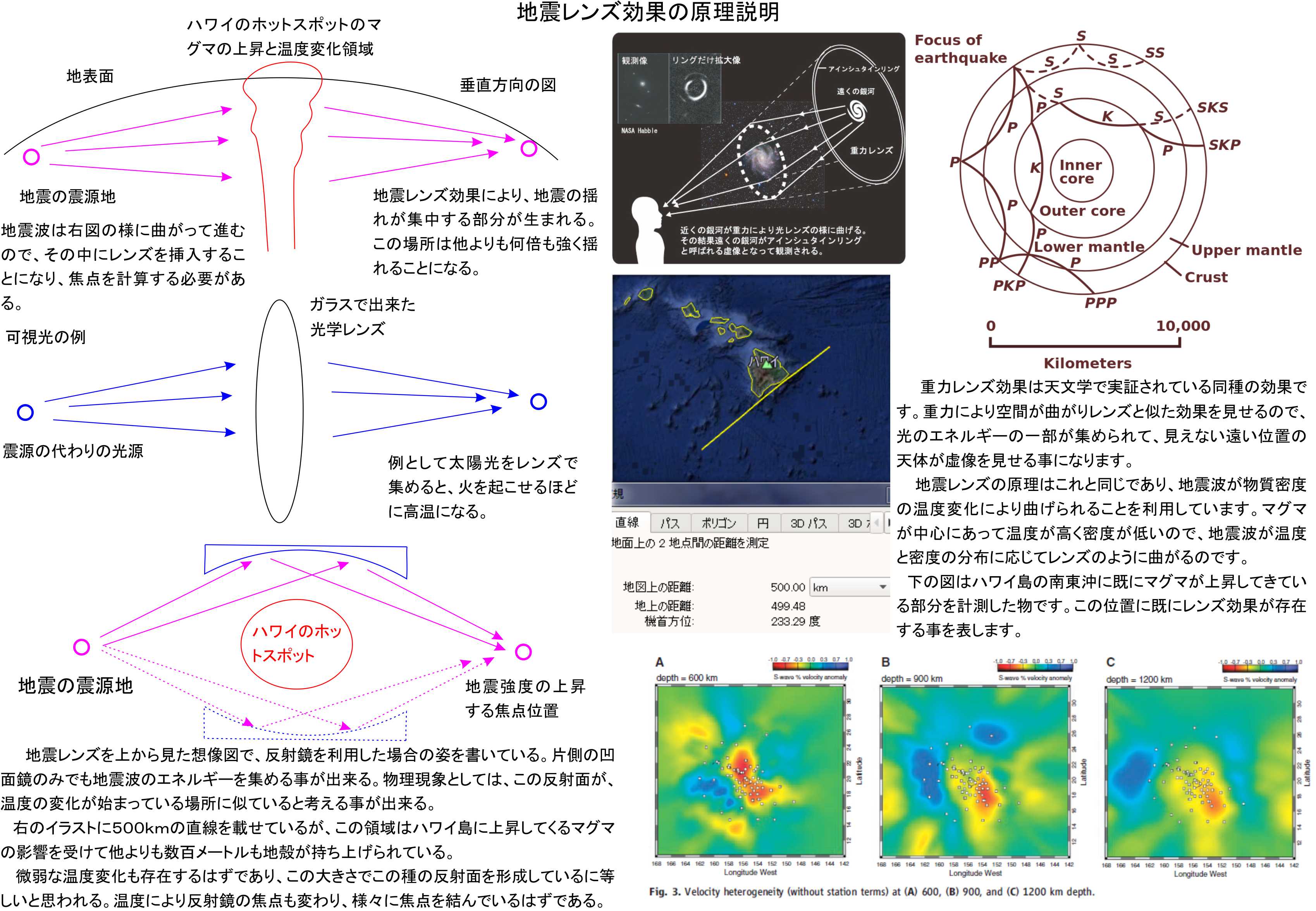 この種の動きの中で、ハワイやイエローストーンなどの周辺を地震波が通る時に、屈折により地震のエネルギーが通常の何倍も届く場所が生まれる事を理解しているのだと思います。