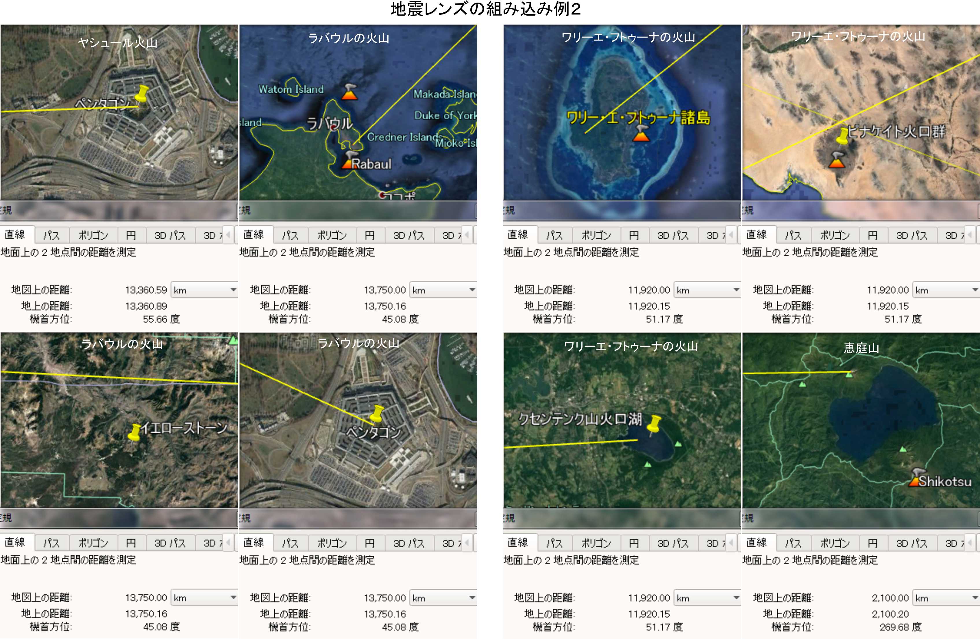 ここに上げた以外にも、ニューヨーク、ビッグラービルの丘とミネラルの丘には、ハワイ、イエローストーン、ピナケイト火口群を通して噴火や地震で影響を出来る場所があると思います。噴火については調べたつもりですが、まだ知られていない海底火山も含めて候補はあるでしょう。直線で重なる部分での地震と噴火に注意が必要です。