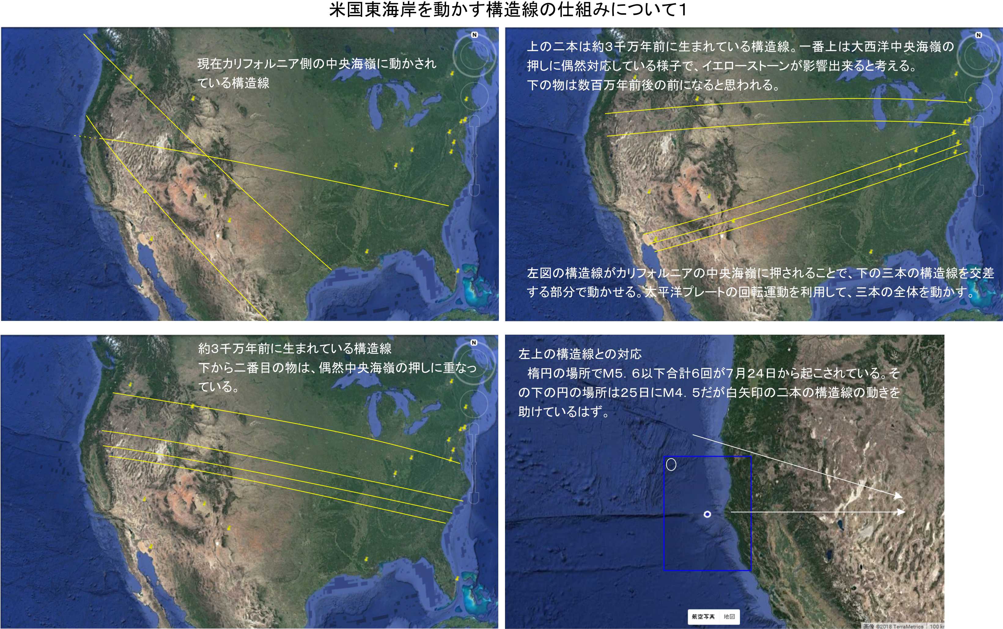 この動きにより、二枚目のイラストの構造線がその動きを容易に出来るようにされています。ピナケイト火口群からワシントンやニューヨーク付近への動きを可能にする構造線三本が、この影響を受けて構造線の交点付近が動かしやすくされたのです。交点付近の構造線が動くのでその動きで構造線が少し揺らされて動きやすくなるというイメージで良いでしょう。
