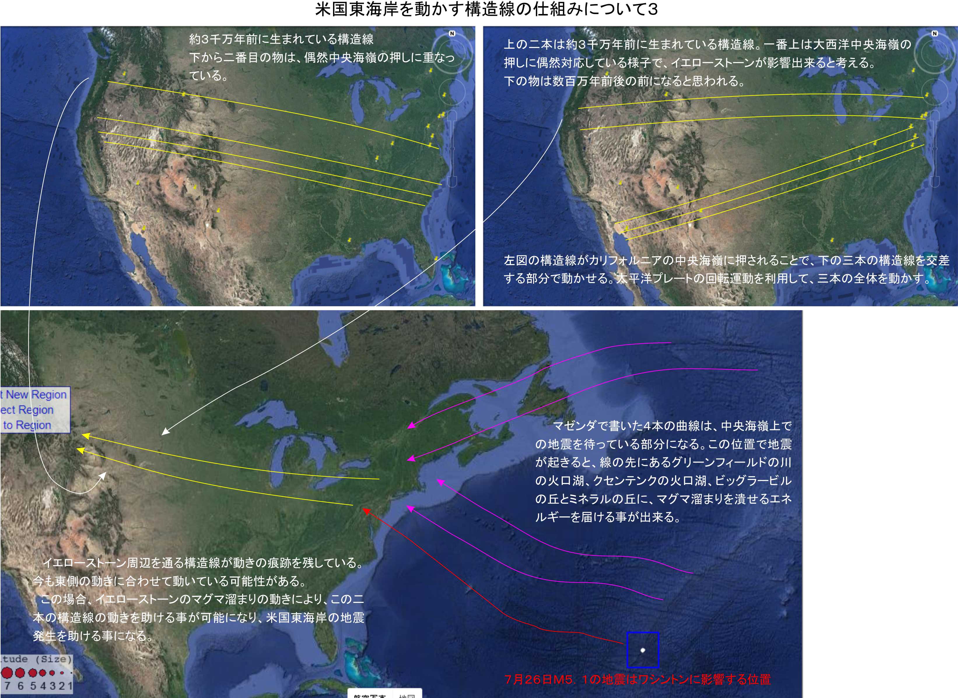 準備の進展状況は、ワシントンが一番です。大西洋中央海嶺側とカリフォルニア側からワシントンに影響力を行使するのですが、ワシントンについてはその両側からの動きが確認できています。この記事は7月28日の深夜に書いていますが、準備の地震の最後はカリフォルニア湾のM4.5の地震で7月28日の日本時間で11時33分の発生でした。 ニューヨークの地震も待っていますが、こちらはまだ目立つ大西洋中央海嶺の地震が起こされずに来ています。カリフォルニア側からはピナケイト火口群周辺の地震で影響が及んでいると考えています。