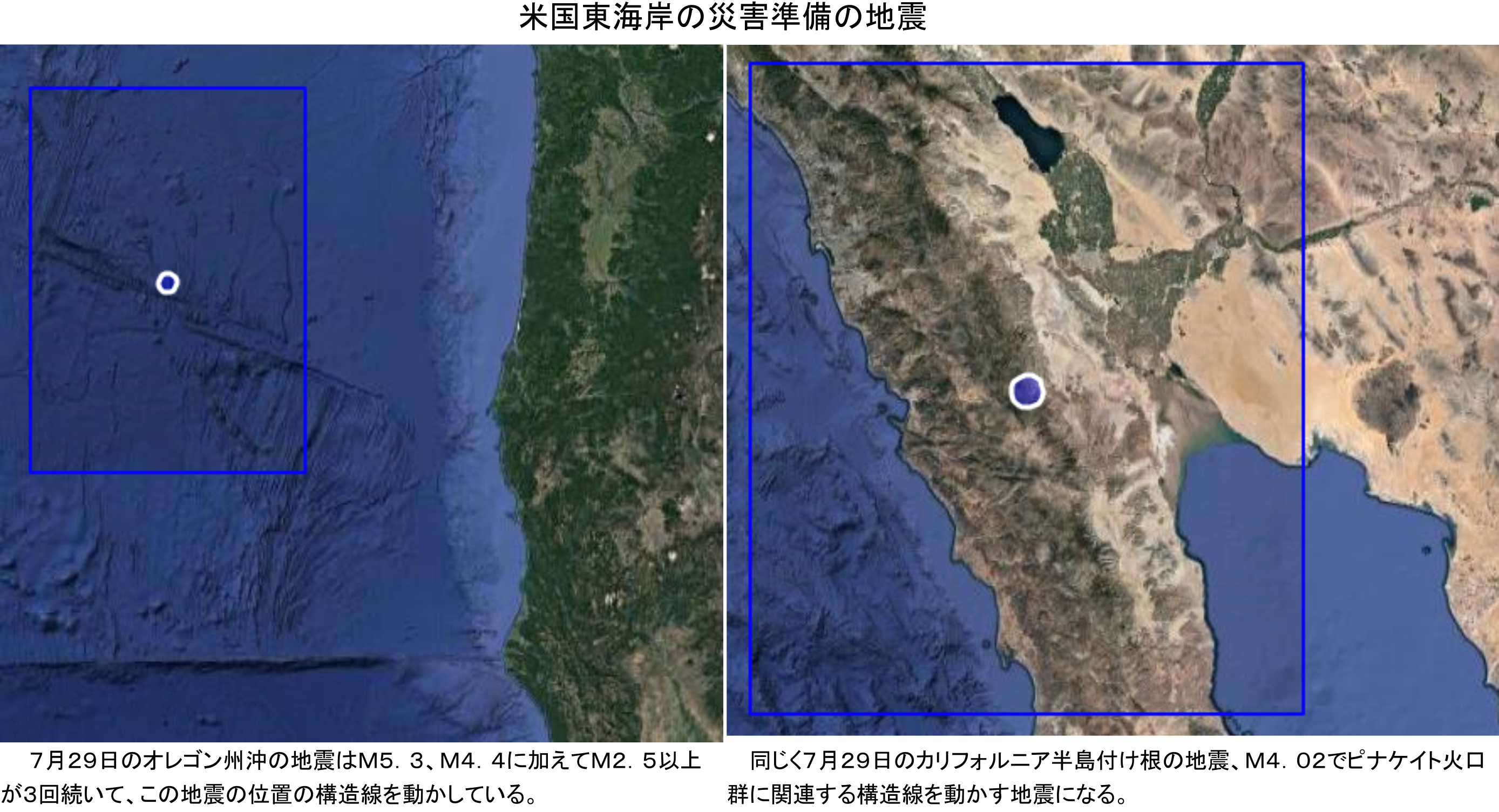 7月24日と25日にM5.6以下の群発地震があり、二本の構造線を動かす部分が進んでいました。カリフォルニアの北部沖の地震であり、中央海嶺に溜め込まれた歪みを解放する地震でした。6回ほどが中央海嶺の中央部で起こされて、その両側にある構造線の動きを促しています。残り一度は南側の構造線上で起こされており、関連する構造線を動かす為に必要なエネルギーを渡した物でしょう。
