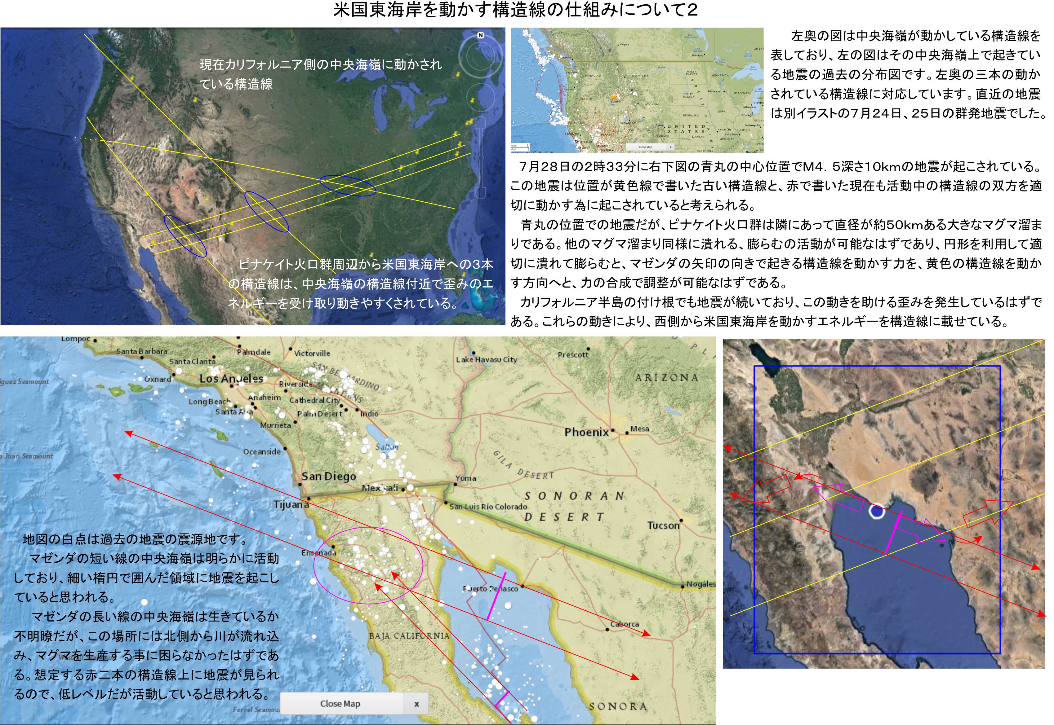 この動きが起きた後に、今度は7月28日にピナケイト火口群の南西側でM4.5の地震が起こされています。この少し前にもカリフォルニア半島の付け根の部分で地震が起こされており、ピナケイト火口群周辺の三本の構造線を動かしやすくする準備が進んでいました。