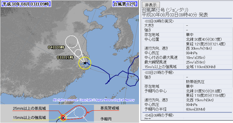 台風12号は順調に上海エリアを調整中です。この動きを待って続きが起きるという脅しを出している状況でしょう。備えて注意をする週末になりそうです。