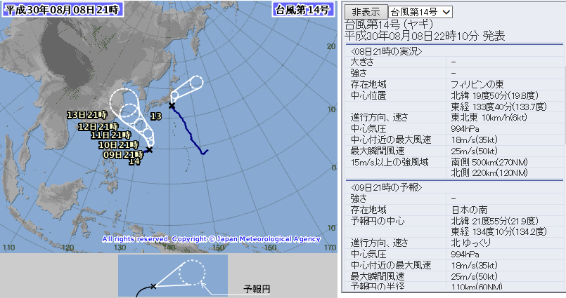 この台風には不思議な部分があり、北西側に雨雲が少ないことです。台風が通過した後に雨の少ないことは普通に多いのですが、来る前の北側で雨雲が少ない状況には異常な気象条件が生み出した台風である事を感じさせています。雨の被害が減ることはありがたいです。加えて自然も無理している部分が明確です。