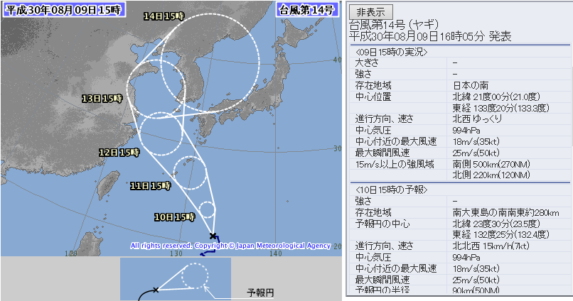8月9日 台風13号の千葉県、茨城県、福島県沖の通過、台風14号の中国向けの進路