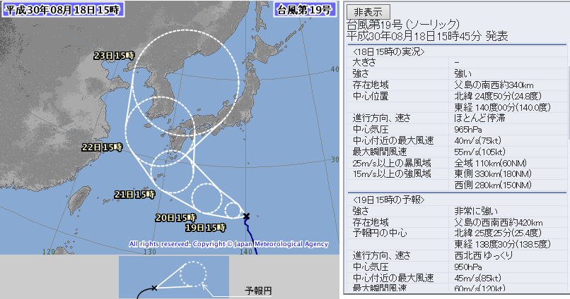 台風19号の進路もこれに関係していると思われ、現在965hPaまで発達している台風は950hPa前後で21日から22日にかけて琉球北部から九州南部、阿蘇山に接近する予定コースです。