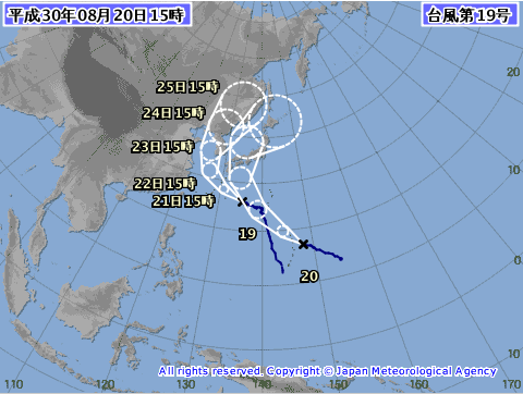 台風は20号が発生し、こちらは24日に日本に上陸できる予想です。予想図を載せます。延々と注意を促すのみならず、ずるずると引き延ばす部分にも今から可能性を見せています。