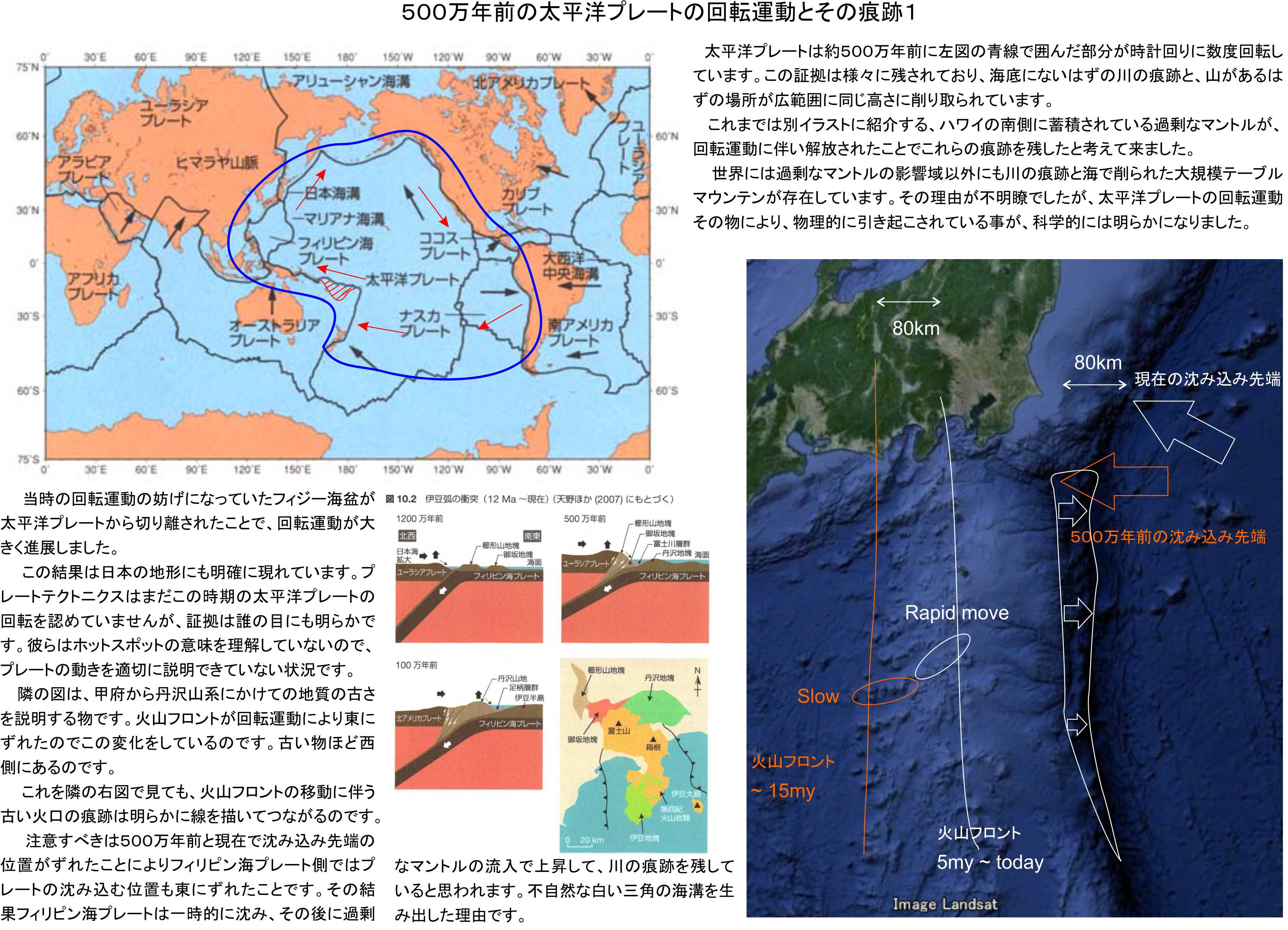 太平洋プレートは約500万年前に、二枚目のイラストの左図の青線で囲んだ部分が時計回りに数度回転しています。この証拠は様々に残されており、海底にないはずの川の痕跡と、山があるはずの場所が広範囲に同じ高さに削り取られています。