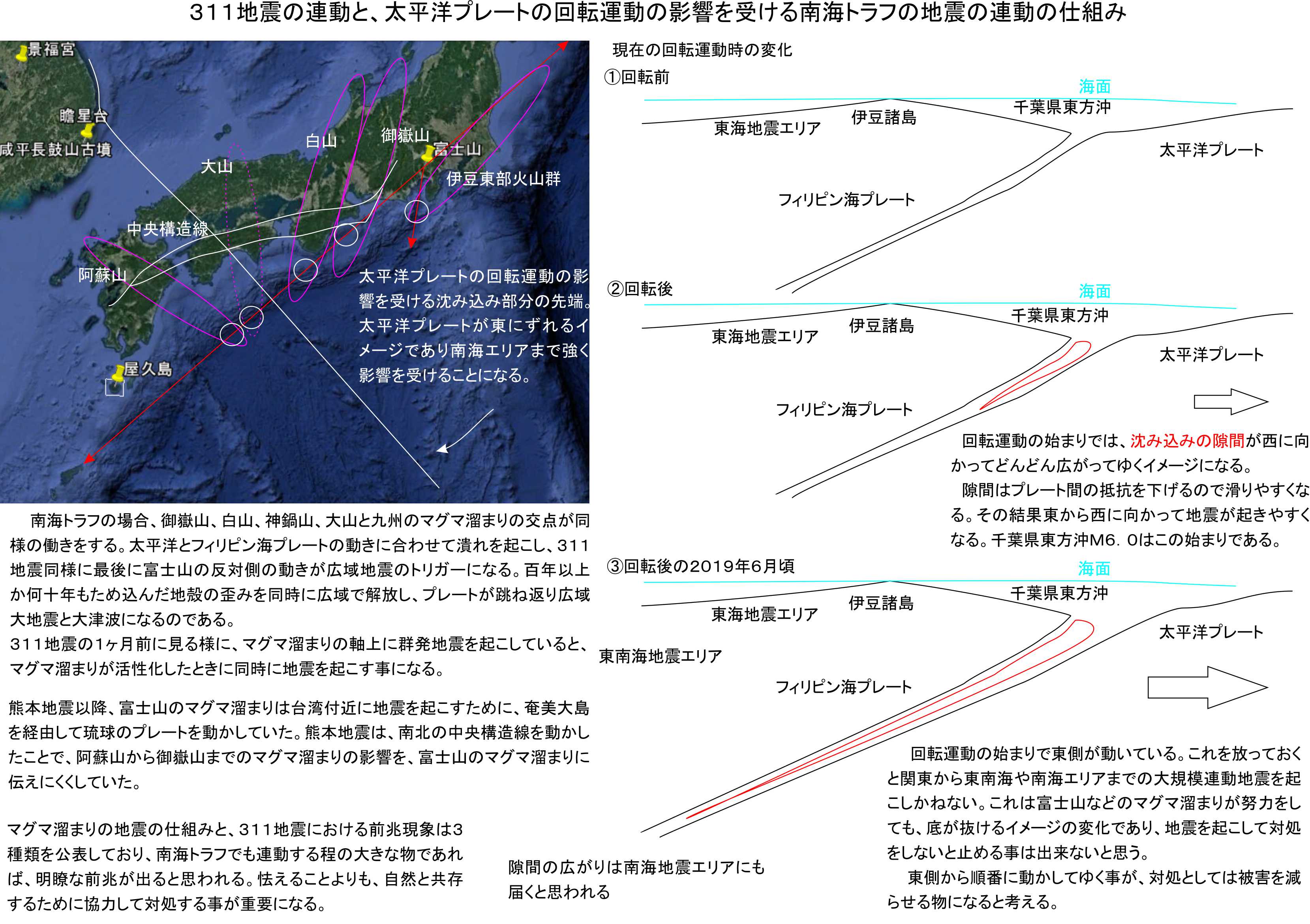 言葉では分かりにくい所ですので、イラストを見てプレートの動きが隙間を生み出す部分を確認下さい。太平洋プレートが回転する動きをすると、例えば伊豆大島や伊豆半島では、下部の太平洋プレートが結果として東に抜き出される様に動いて、隙間を広げるのです。