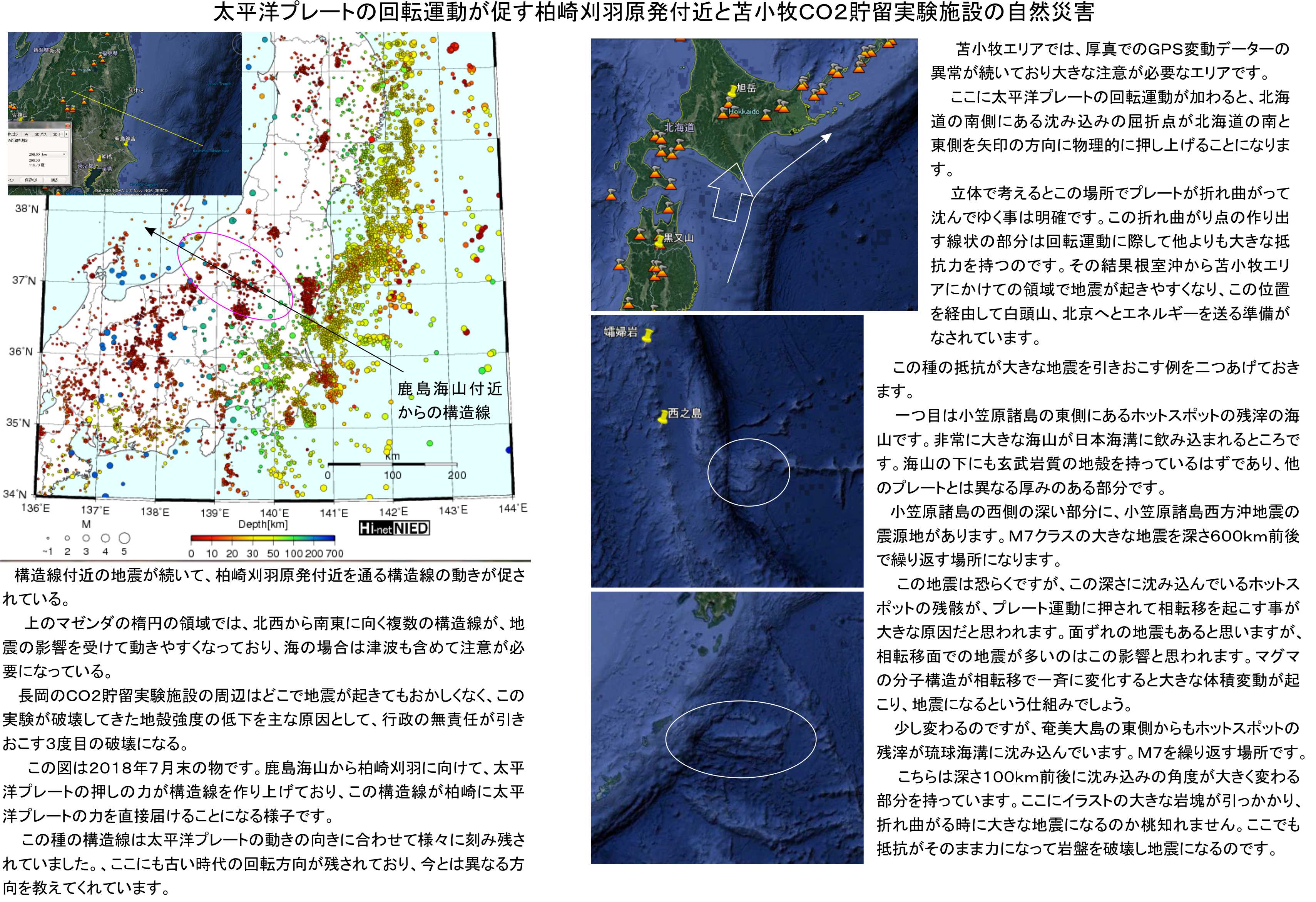 この他に日本では柏崎刈羽原発の付近と苫小牧のCO2貯留実験施設の周辺に自然災害のリスクが高まっています。柏崎刈羽原発の付近の状況については既に記事を書いていますので参照下さい。太平洋プレートの沈み込み先端から構造線で柏崎刈羽原発の付近が動かされるイメージです。太平洋プレートの回転運動が進展すると、どうしてもこの構造線が動いて地震になりやすい場所になるので、今後も注意の継続が必要な場所になります。