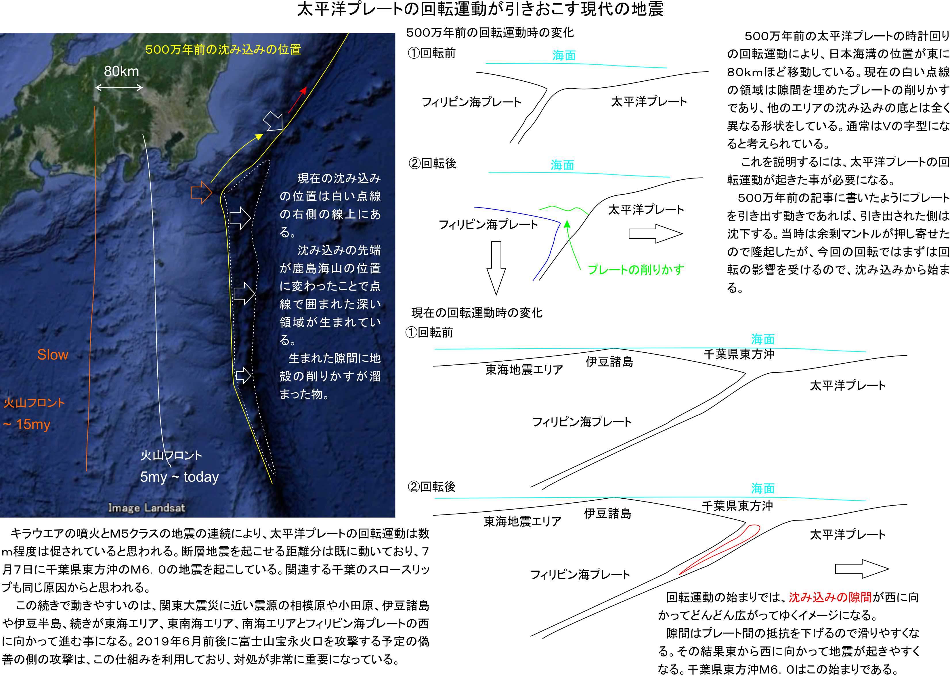 太平洋プレートに回転運動が起きると、1枚目のイラストに説明する動きがフィリピン海プレート下部に生まれます。500万年前と同じように、太平洋プレートは北北東に向かってずれて、如何にもプレートが東にずれる様に隙間を広げるのです。