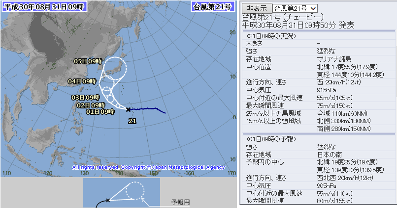 台風21号の解析です。本日で既に915hPaに発達し、9月5日に日本に接近する予報のままです。