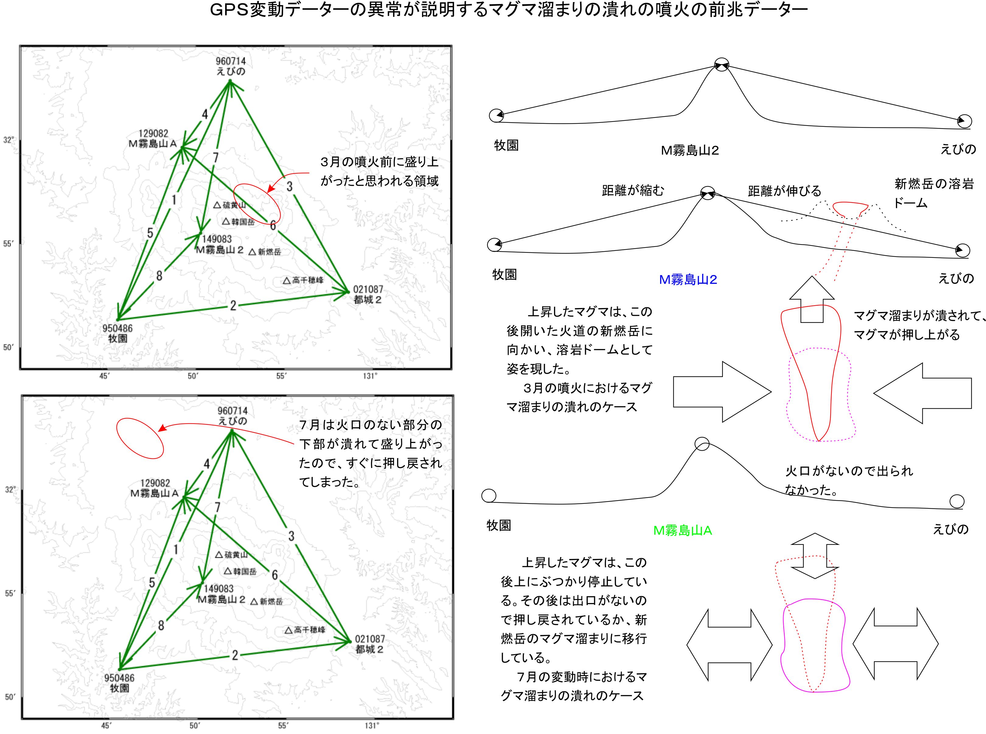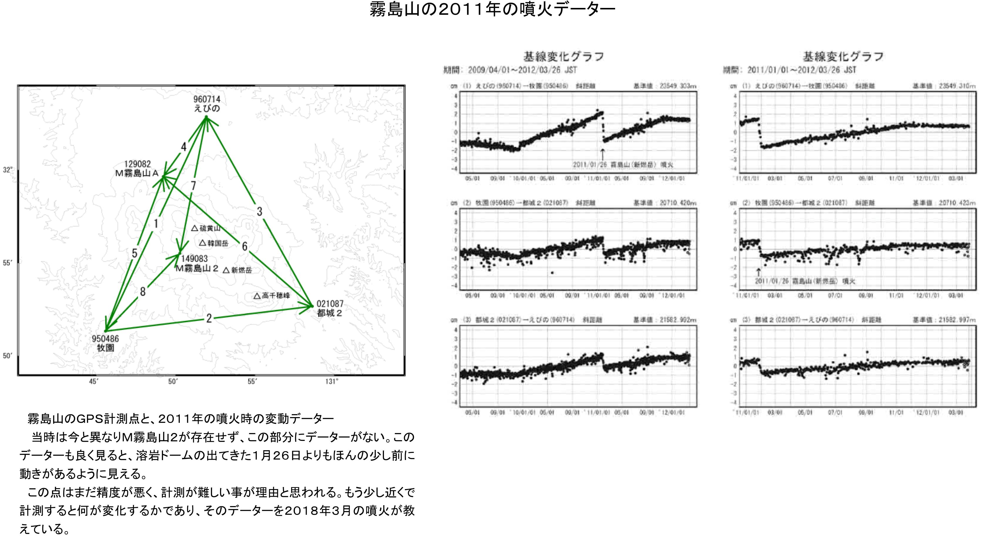 2011年の噴火では、当時のGPS計測と同じ場所での計測の比較が出来ているでしょう。傾向は同じであり、マグマ溜まりの潰れで距離を短くしています。