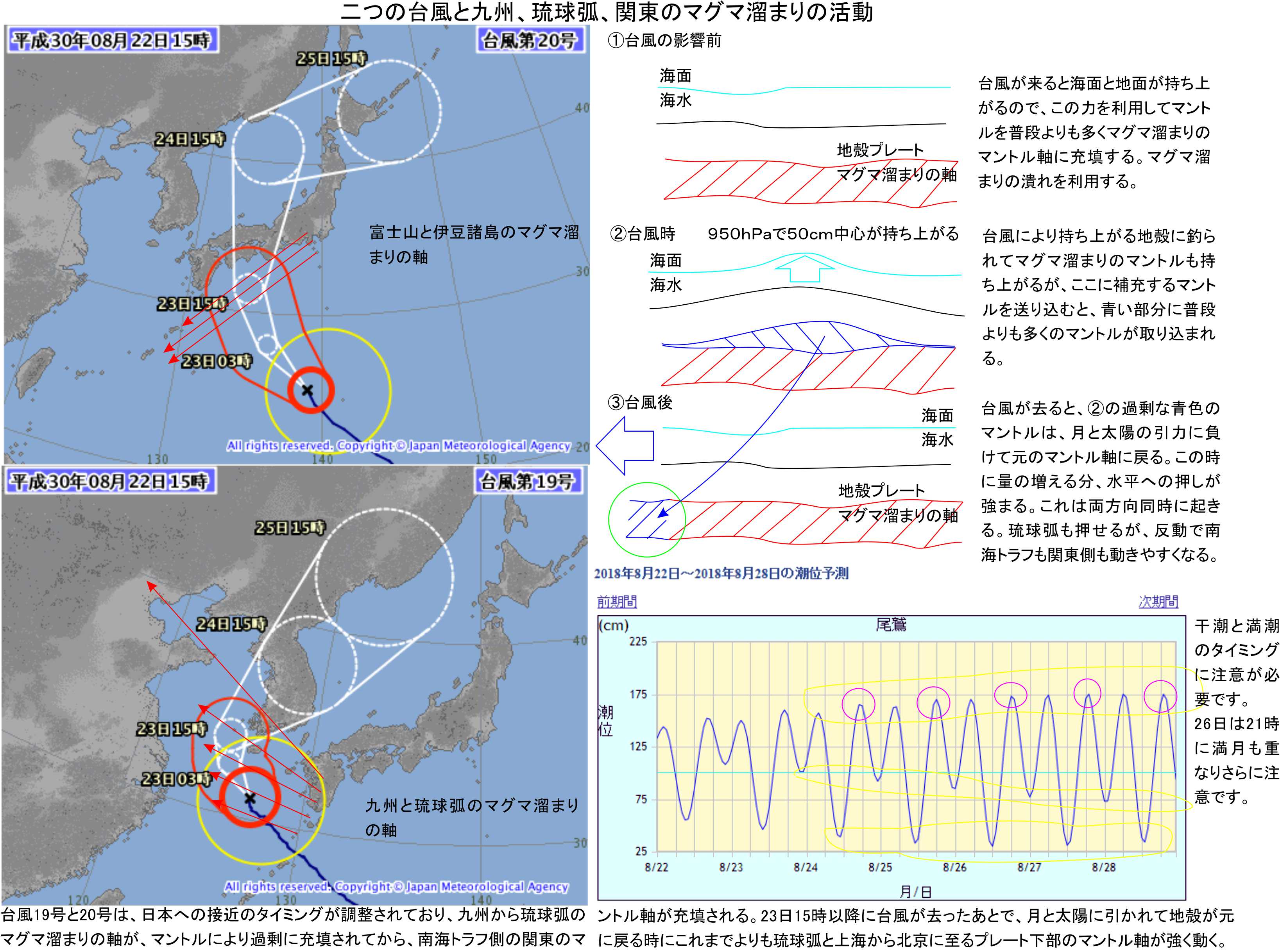 その結果で、8月26日の154回の火山性地震が起こされていると思われます。これは充填されたマントルが上海へ押し出す部分と、霧島山に戻ってくる部分の影響です。作用反作用の法則で、月と太陽の引力が台風が持ち上げた地殻を押し戻すときに、上海と霧島山を同時に押すのです。その結果のエネルギーが火山性地震で放出されているのでしょう。始めにデーターを見たときには何かを始める準備かと思いましたが、状況を検討すると、この部分は充填したマントルの戻りと考えると納得でした。上海を動かすエリアへは確実に影響が及んでいるでしょう。