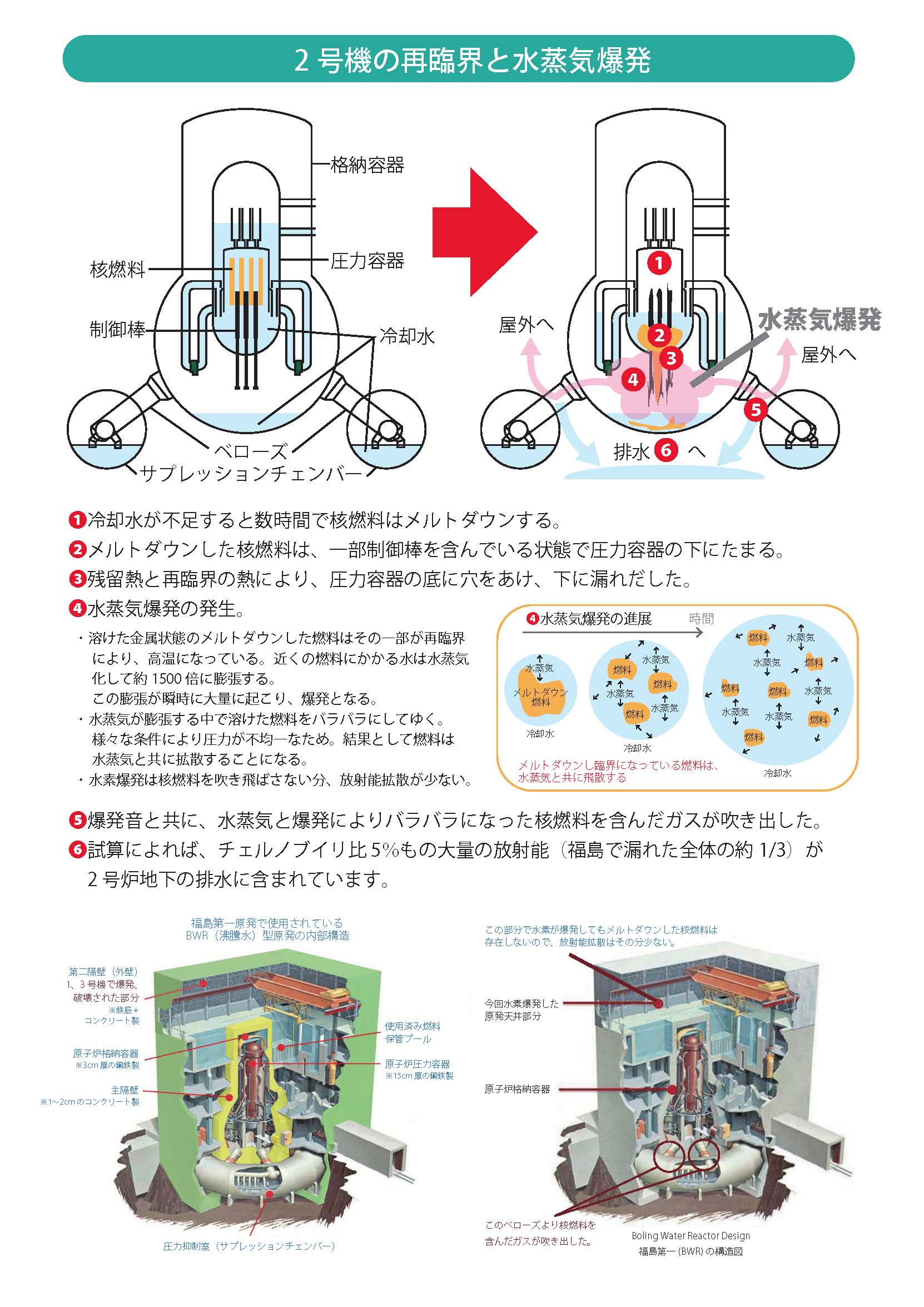 2011年3月11日の東北の災害により2号炉でメルトダウンが発生し、3月15日の6時10分に局所再臨界による水蒸気爆発が起きた。弱い配管から気密、閉じ込めが失われ、大量の放射能が燃料と共に漏れ、拡散している。