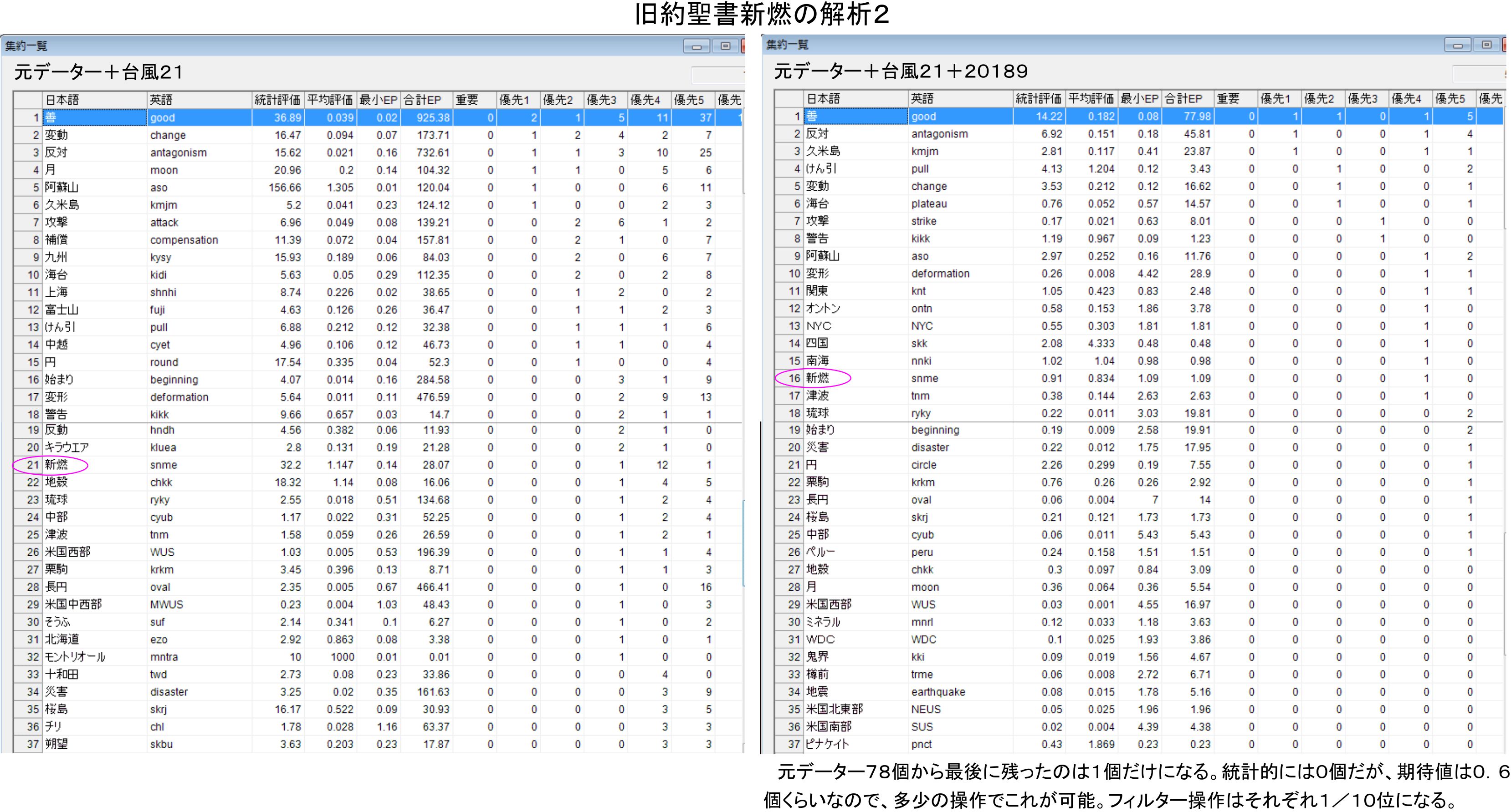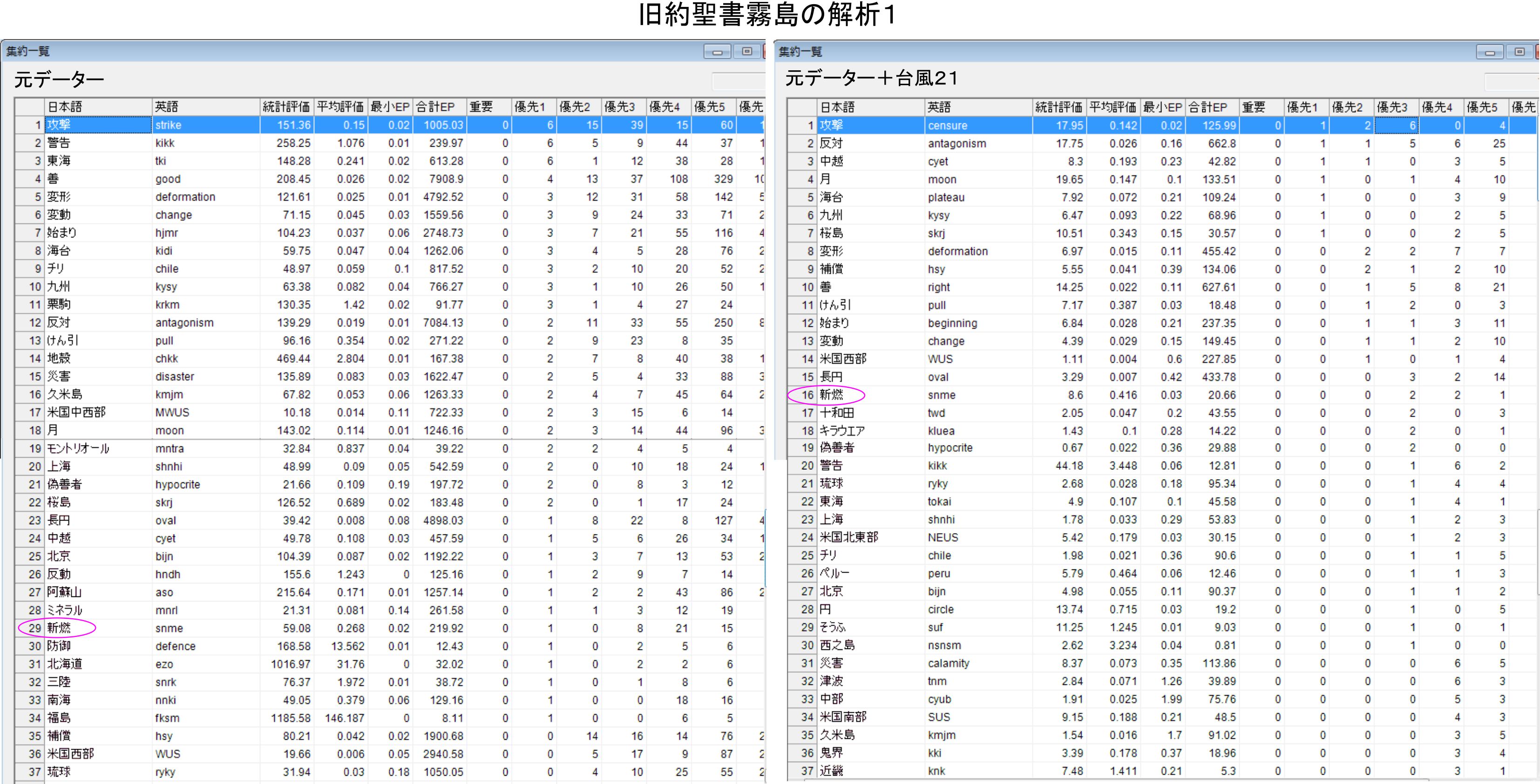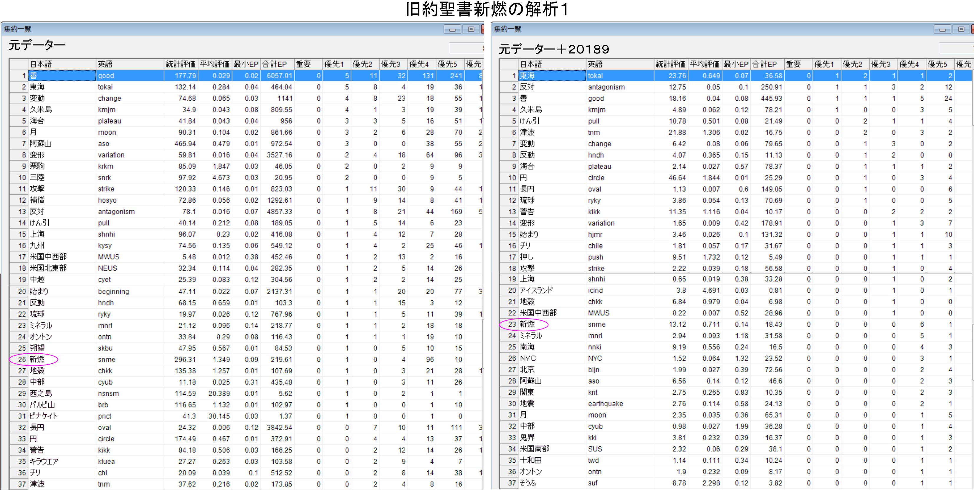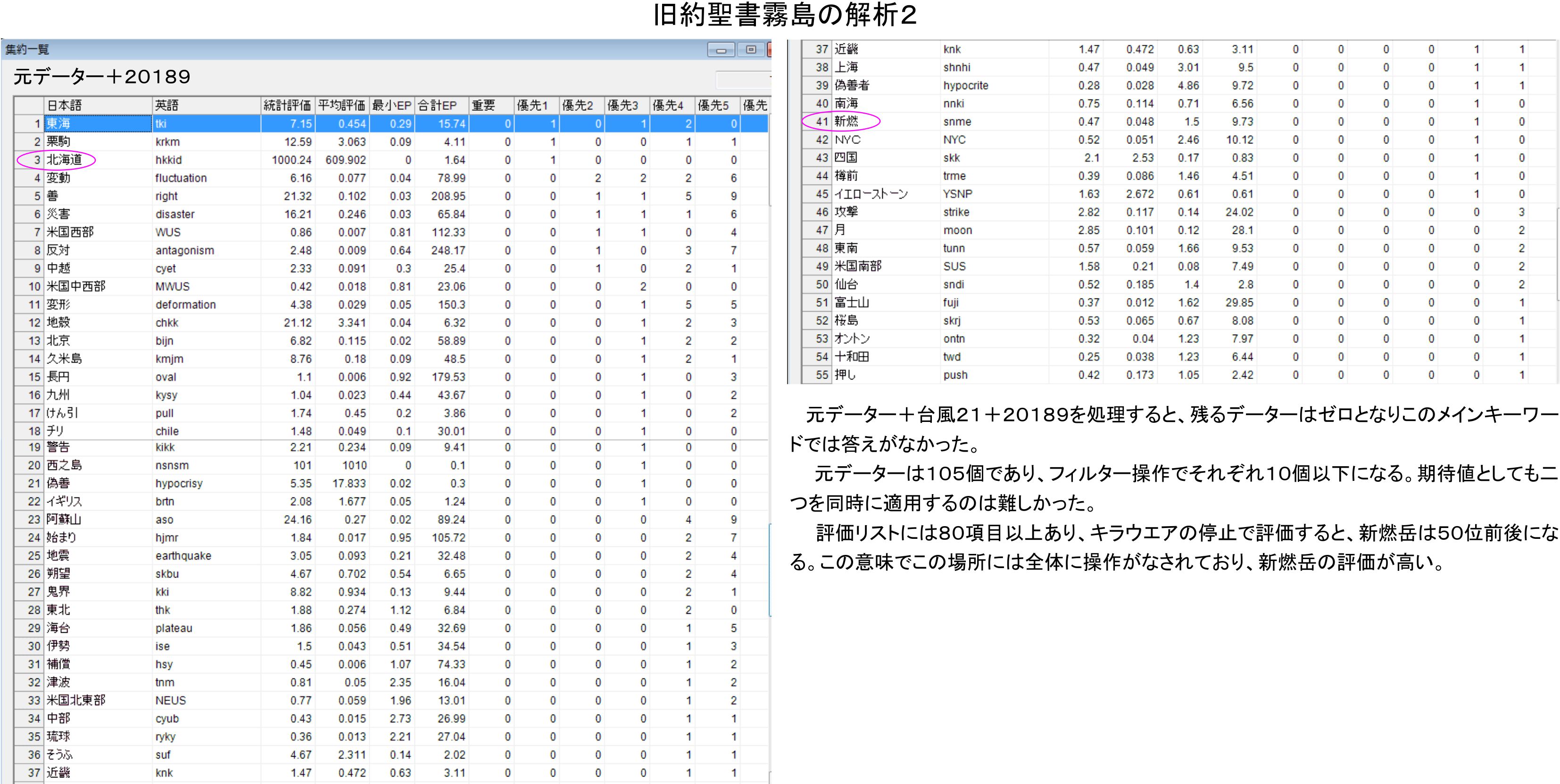 これで考えると、旧約聖書霧島側は、統計操作をして新燃の言葉を一つ、余分に組み込んで見せていることになるのです。これは統計評価上も結果に表れていることであり、数が多いからこそ、他の普通の物では50位なのに、ここでは44~16位までの操作が出来ているのです。