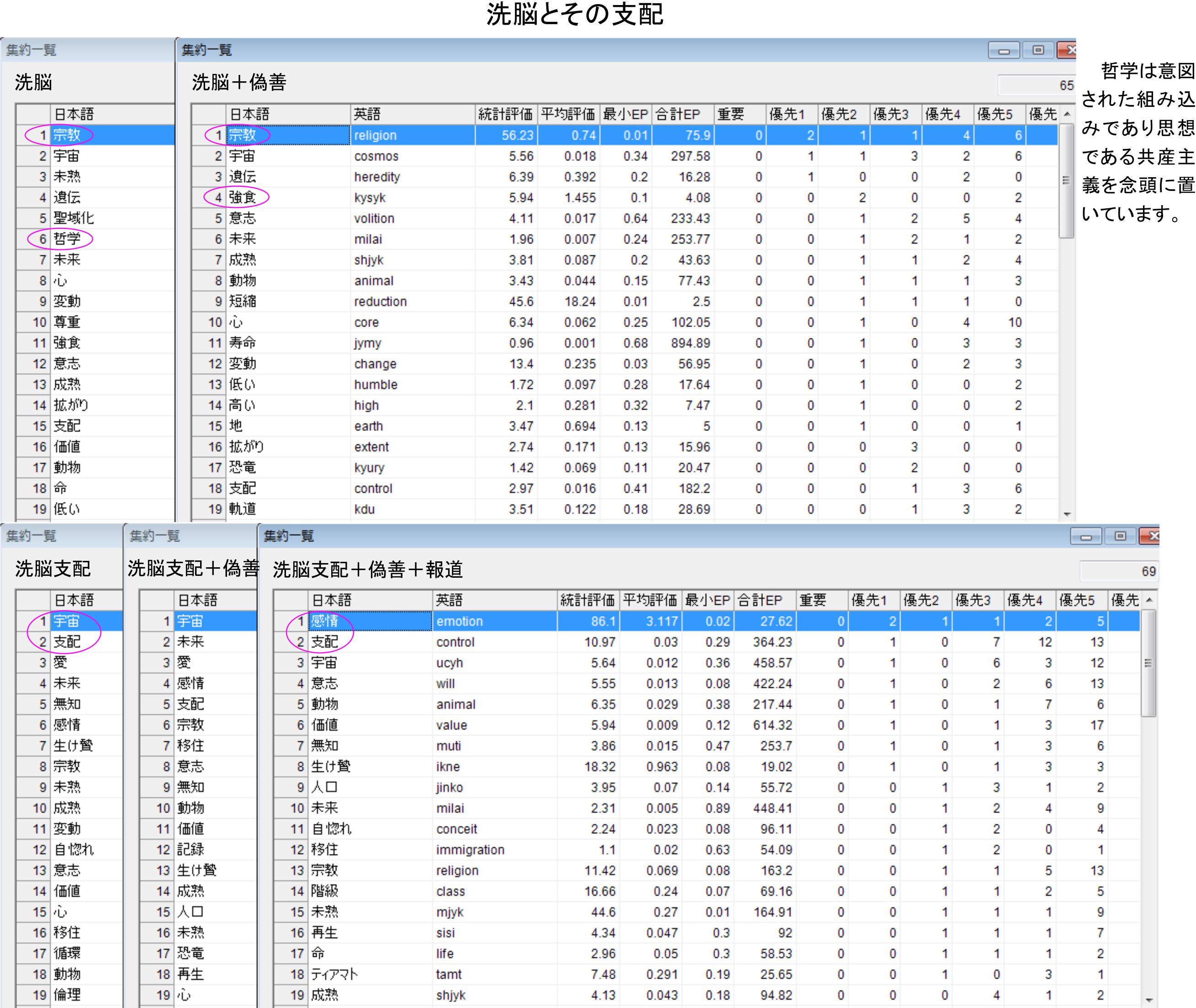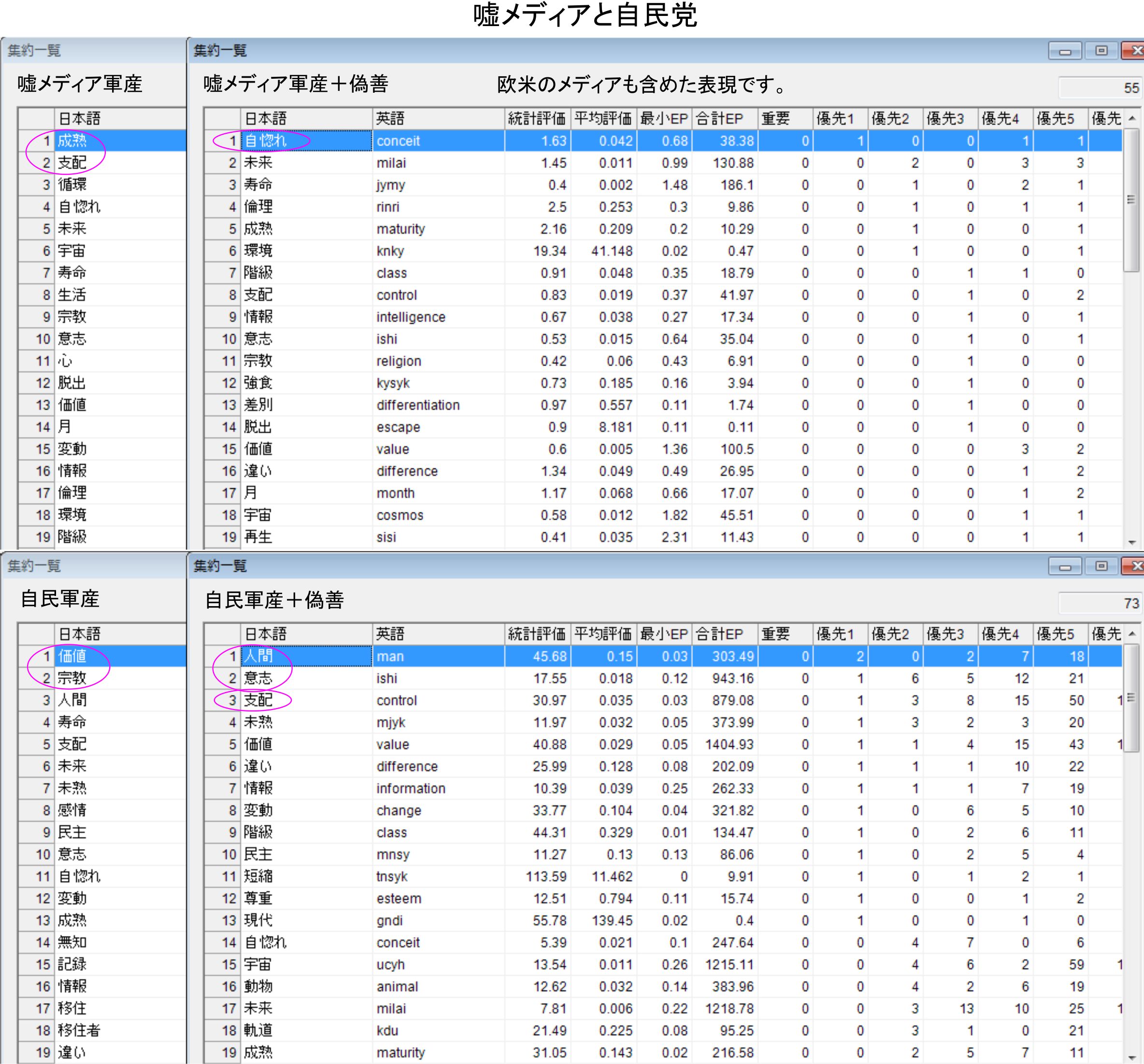 最後の最後が自民党の姿を調べた物です。自民軍産では価値と宗教が一番二番、ここに偽善を加えると、一番二番が人間、意志、三番目が支配です。自民の支配は宗教支配に価値を置くとも見え、今の公明党の利用にも現れています。支配に洗脳が利用されている姿が宗教なのでしょう。
