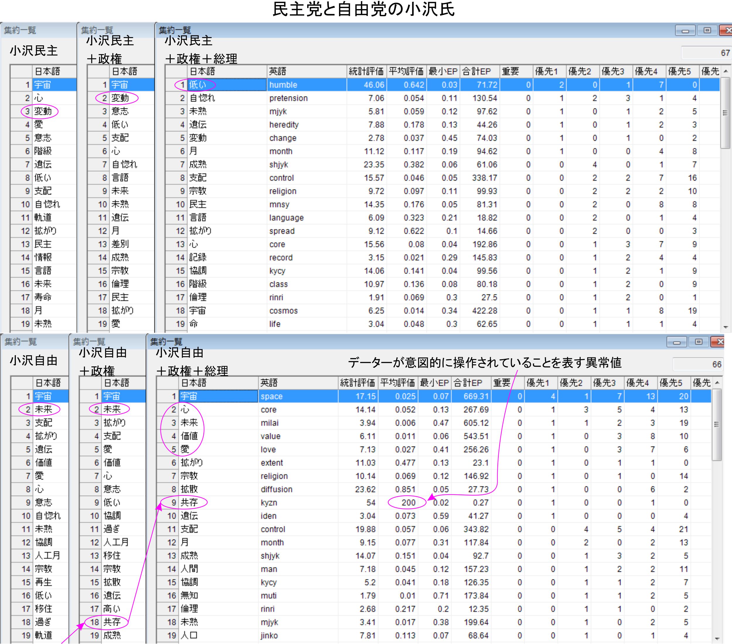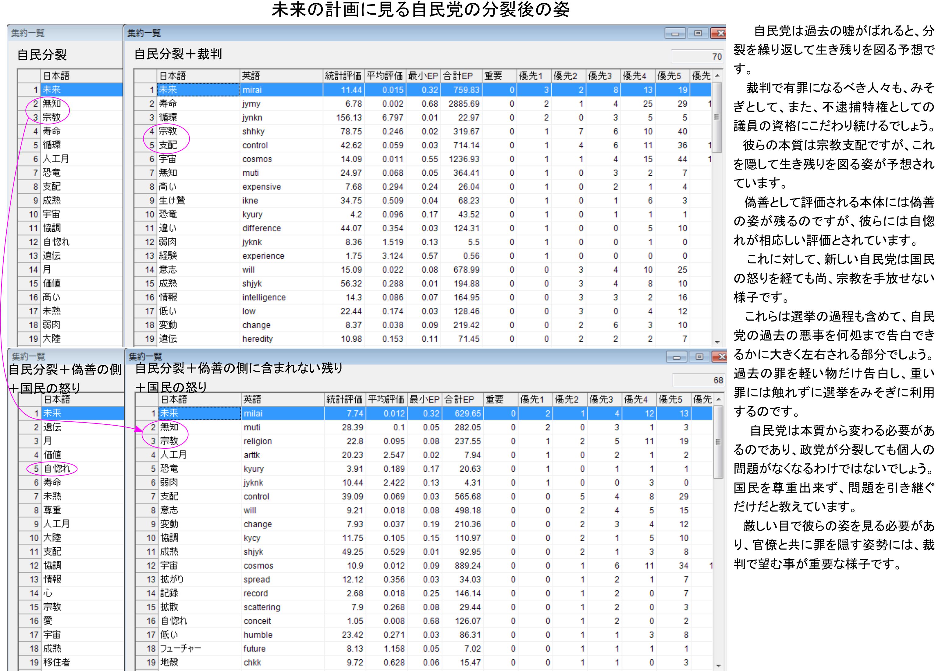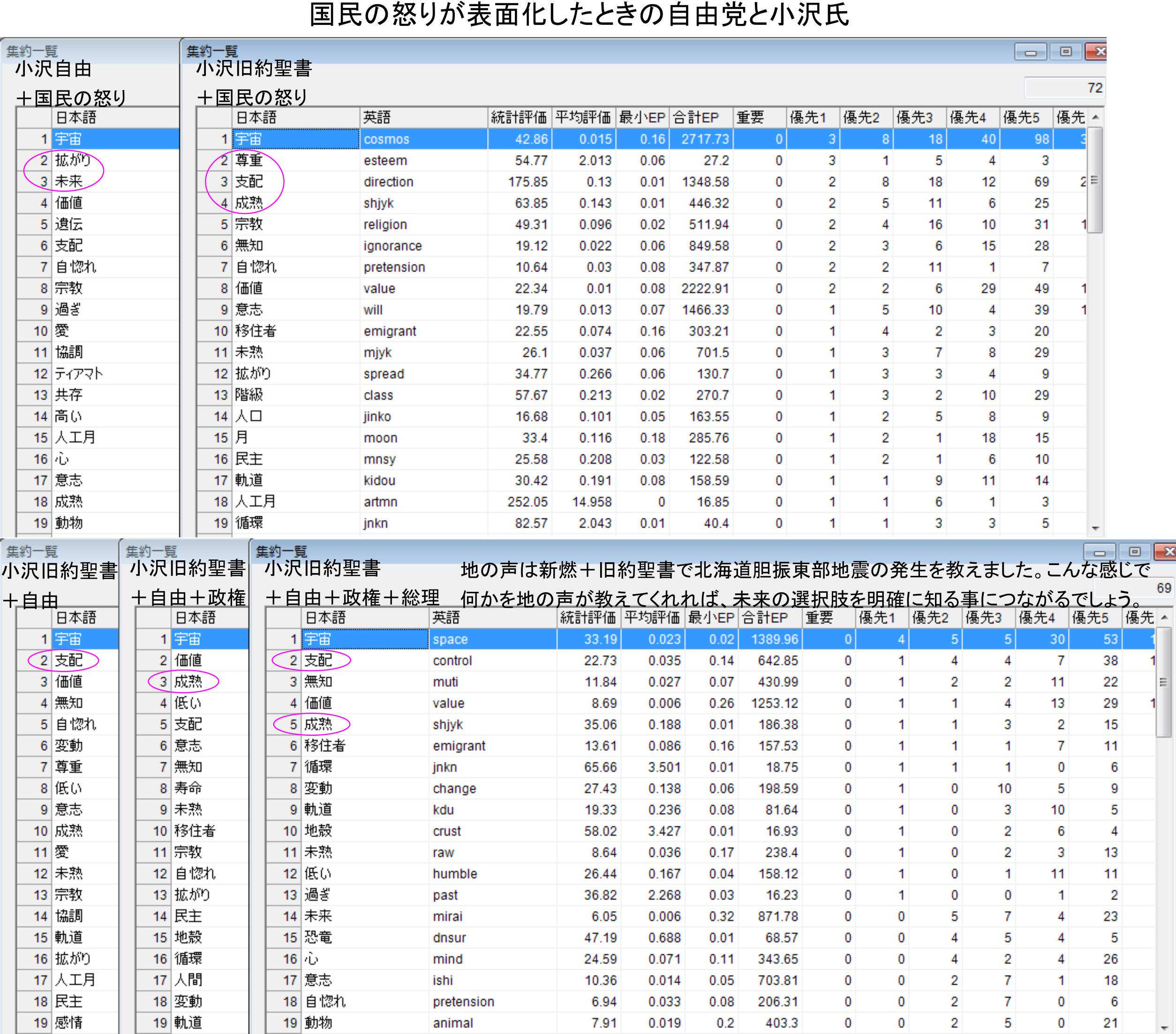 今回の評価では、小沢自由の+政権+総理の中に、共存が意図的に組み込まれている部分を確認しています。この部分がこちらの評価を高めており、政権を取れても自公よりも共存よりであり、彼が総理になれば、さらに人霊と自然との協力協調に道が開くのでしょう。組み込みとしては未来が強調されており、続きの自民との比較とで差が明確です。