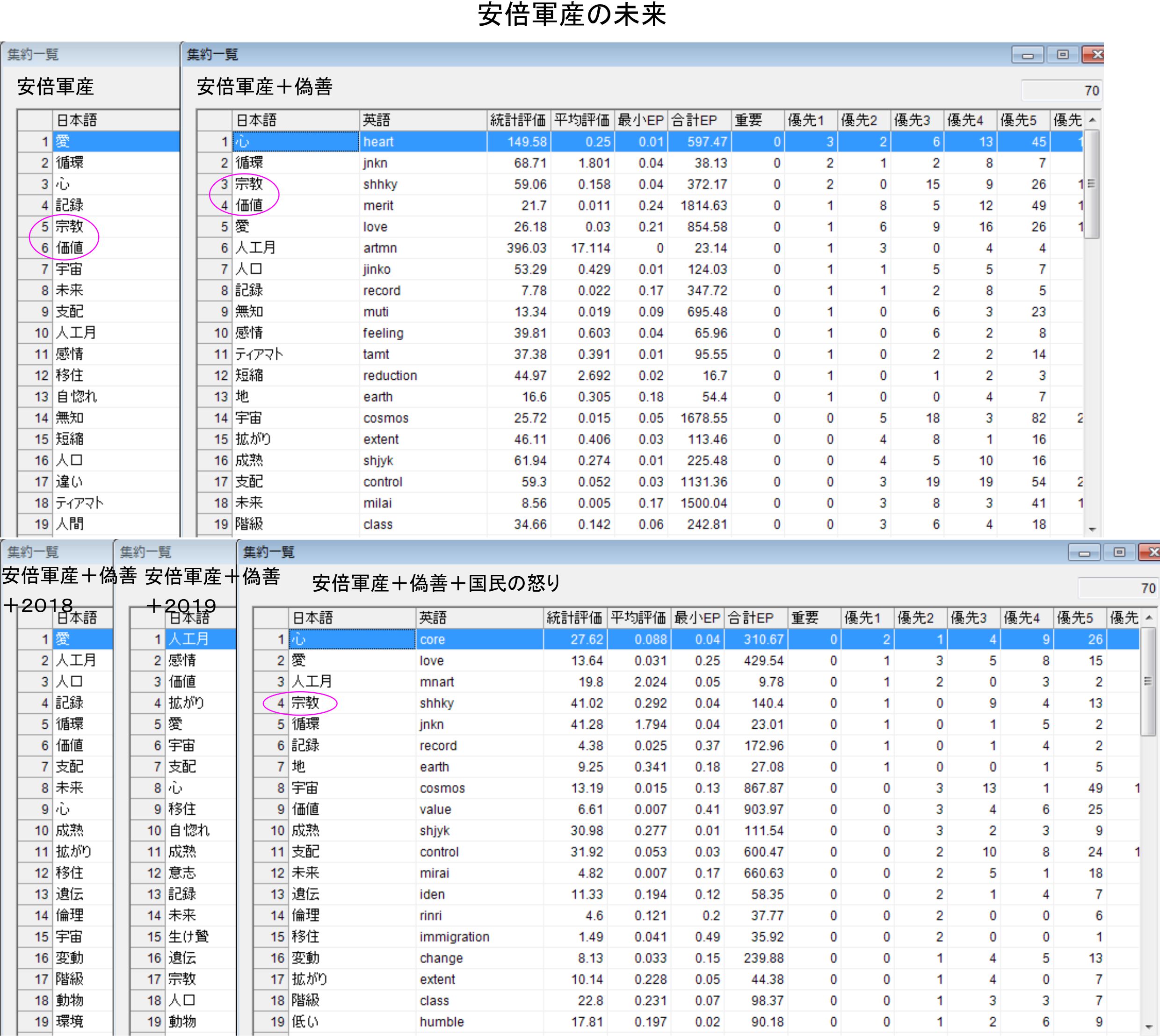 それでも比較は行いたいので、この先の国民の怒りが爆発する部分を考えて、フィルター処理を+国民の怒り、としました。その結果でも安倍軍産は宗教でした。これまで国民を騙してきた以上、騙し続けるより、残された道はないという哀れな結果でした。こうなると国民が怒り出すかどうかで大きく未来は変わるという事になります。