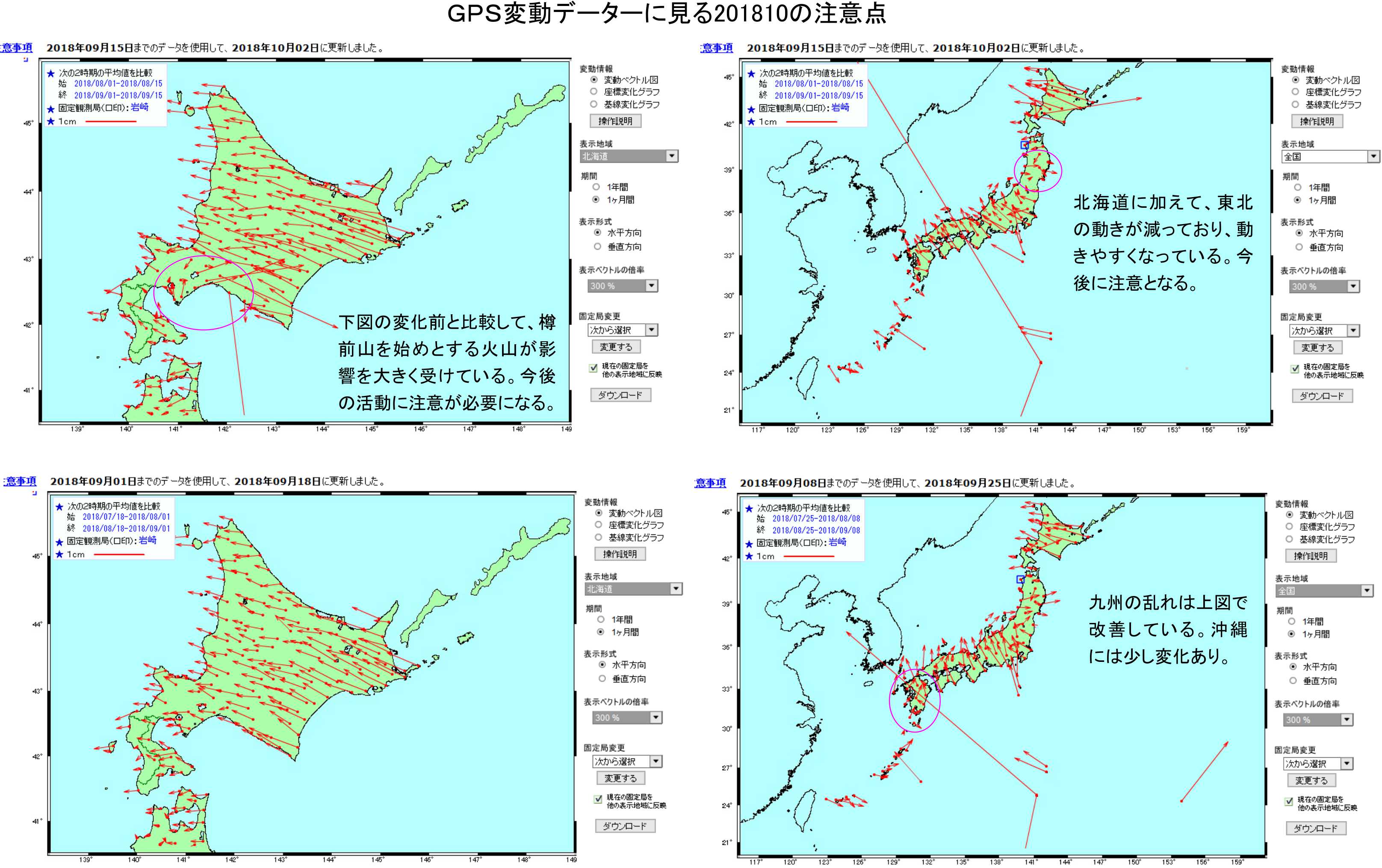 9月6日の北海道胆振東部地震の影響で大きな変化が出ています。7月のスロースリップの影響で伊豆の火山にも影響が出ましたが、その時はそのままに収まっています。福島でM7が起きたときも大きなGPS変動でしたが、吾妻山他には大きな影響はありませんでした。